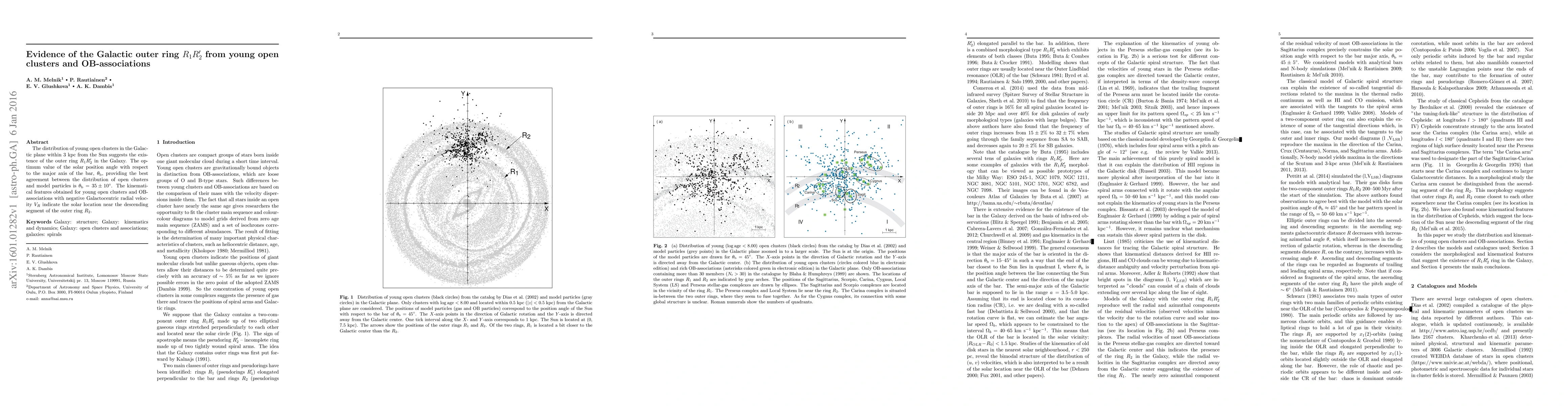 Summary: The study reveals the existence of the Galactic outer ring R1R2' through the distribution of young open clusters, with the Sun positioned at a solar position angle of theta_b=35 +/- 10 degrees relative to the major axis of the bar. The negative Galactocentric radial velocity of young open clusters and OB-associations suggests the solar location near the descending segment of the outer ring R2.