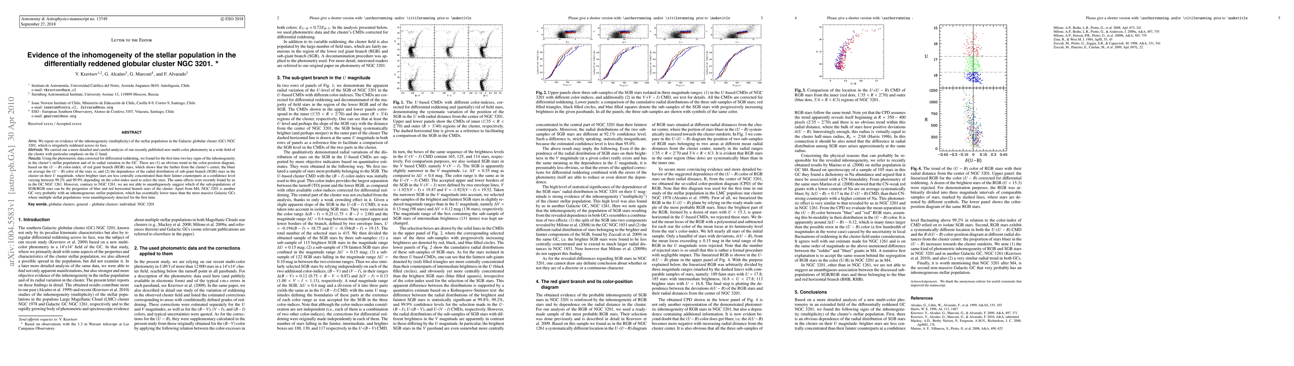 The study utilized new multi-color photometry in a wide field of the differentially reddened globular cluster NGC 3201, focusing on the U band, to analyze its stellar population inhomogeneity.