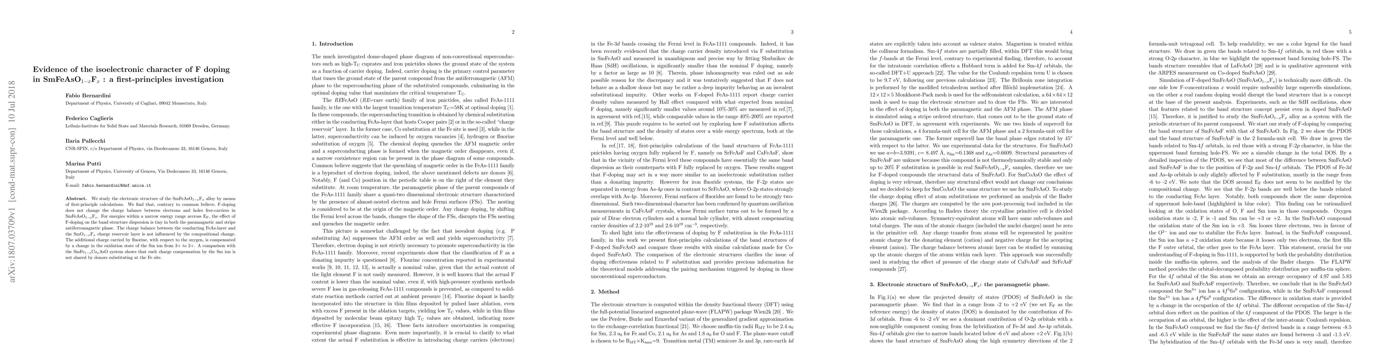 This paper uses first-principles calculations to demonstrate that F doping in SmFeAsO(1-x)F(x) maintains isoelectronic character, with no change in charge balance between electrons and holes. The study reveals that fluorine doping minimally affects the band structure and charge balance within the FeAs-layer and SmO(1-x)F(x) charge reservoir layer, with the additional charge compensated by Sm oxidation state change.