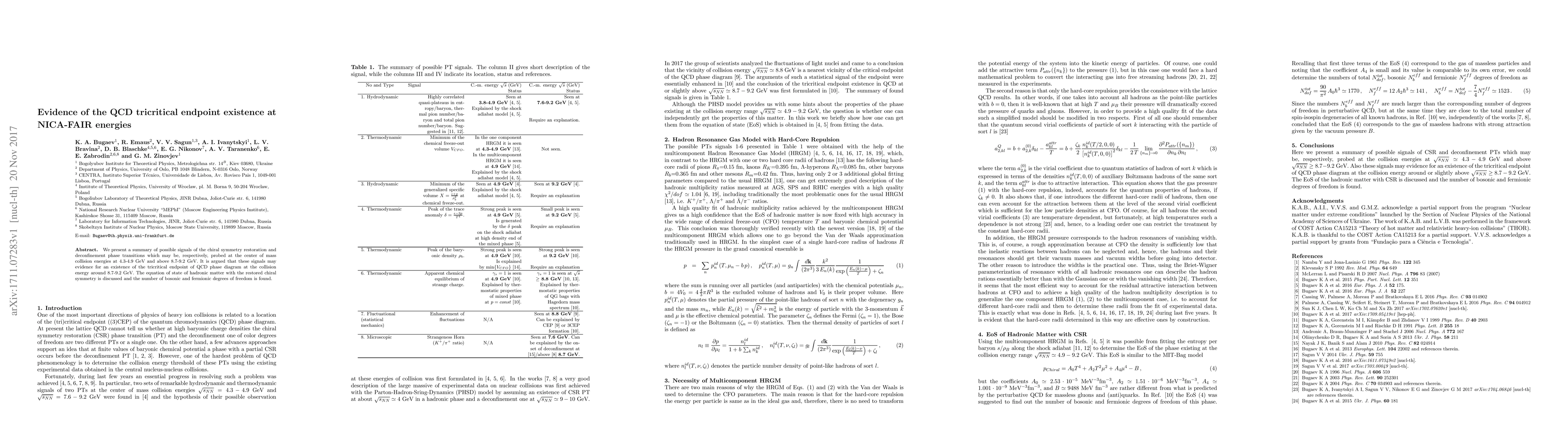 We present a summary of possible signals of the chiral symmetry restoration and deconfinement phase transitions which may be, respectively, probed at the center of mass collision energies at 4.3-4.9 GeV and above 8.7-9.2 GeV. It is argued that these signals may evidence for an existence of the tricritical endpoint of QCD phase diagram at the collision energy around 8.7-9.2 GeV. The equation of state of hadronic matter with the restored chiral symmetry is discussed and the number of bosonic and fermionic degrees of freedom is found.