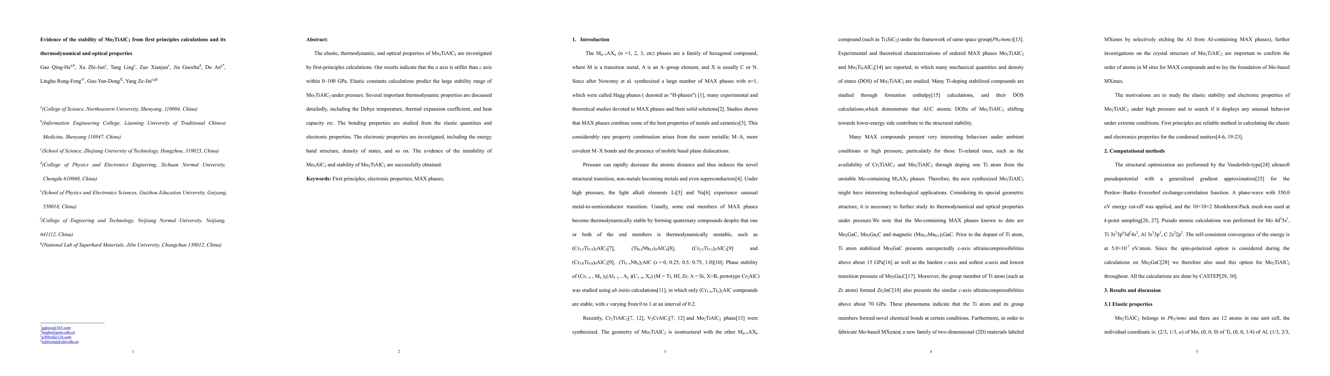 This paper investigates the stability, thermodynamic, and optical properties of Mo_{2}TiAlC_{2} using first-principles calculations. The study finds Mo_{2}TiAlC_{2} to be stable under pressure, with the a axis being stiffer than the c axis, and discusses its Debye temperature, thermal expansion, and heat capacity.