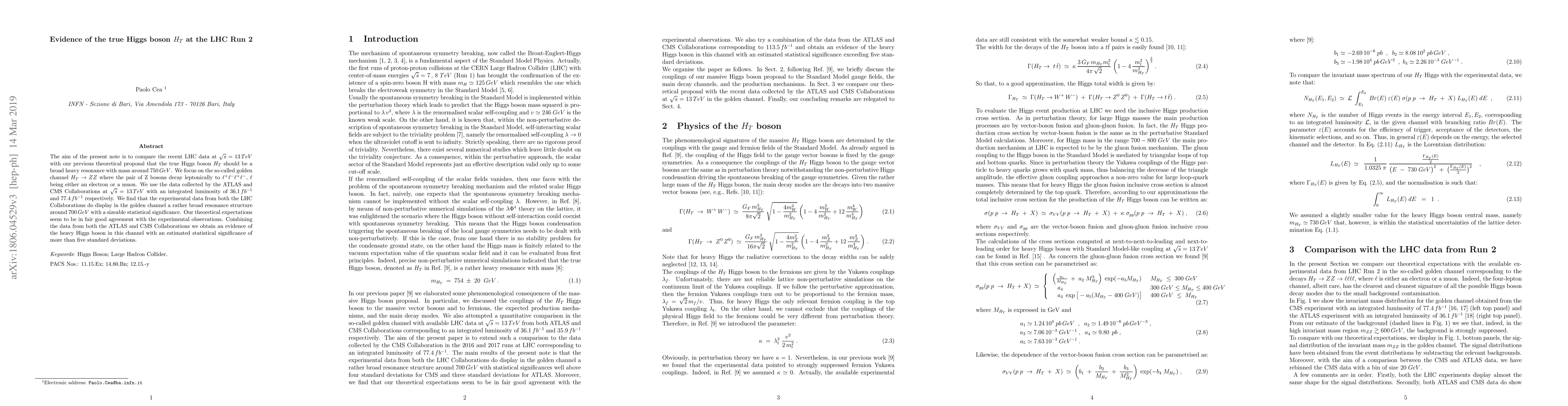 The aim of the present note is to compare the recent LHC data at $\sqrt{s} =13 \,TeV$ with our previous theoretical proposal that the true Higgs boson $H_T$ should be a broad heavy resonance with mass around $750 \, GeV$. We focus on the so-called golden channel $H_T \rightarrow ZZ$ where the pair of Z bosons decay leptonically to $\ell^+ \ell^- \ell^+ \ell^-$, $\ell$ being either an electron or a muon. We use the data collected by the ATLAS and CMS Collaborations at $\sqrt{s} =13 \,TeV$ with an integrated luminosity of $36.1 \, fb^{-1}$ and $77.4 \, fb^{-1}$ respectively. We find that the experimental data from both the LHC Collaborations do display in the golden channel a rather broad resonance structure around $700 \, GeV$ with a sizeable statistical significance. Our theoretical expectations seem to be in fair good agreement with the experimental observations. Combining the data from both the ATLAS and CMS Collaborations we obtain an evidence of the heavy Higgs boson in this channel with an estimated statistical significance of more than five standard deviations.