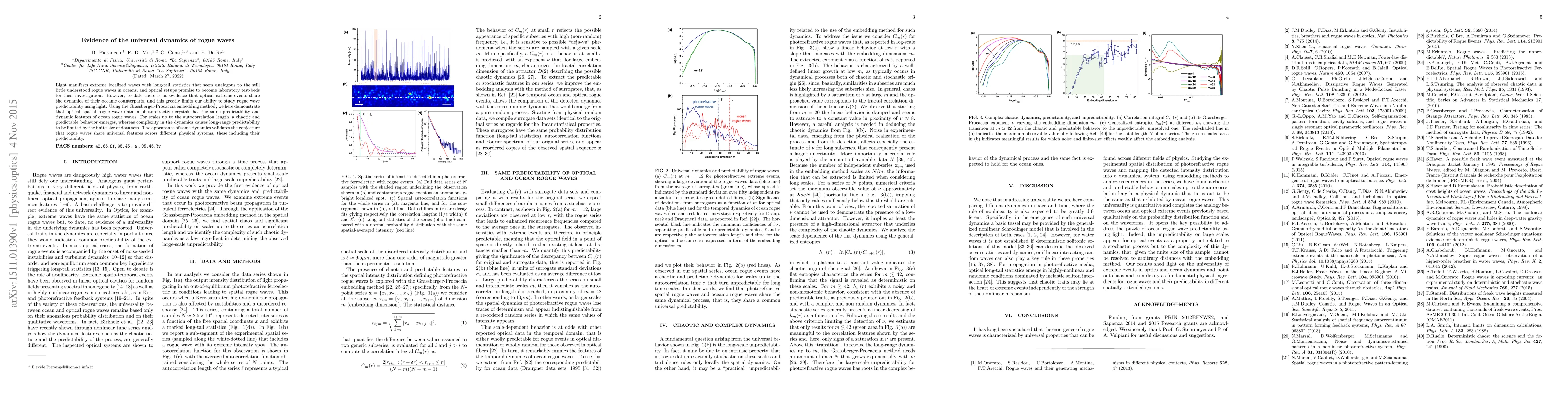 This paper demonstrates that optical rogue waves in photorefractive crystals exhibit the same chaotic and predictable dynamics as oceanic rogue waves using the Grassberger-Procaccia method, suggesting universal features and predictability across different physical systems. However, while short-term dynamics are predictable, long-range predictability is constrained by data set size.