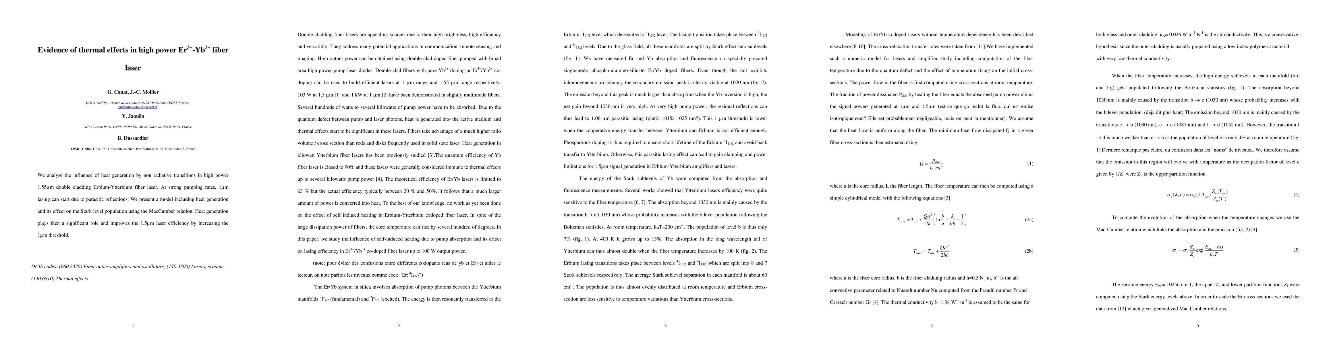 We analyse the influence of heat generation by non radiative transitions in high power 1.55$\mu$m double cladding Erbium-Ytterbium fiber laser. At strong pumping rates, 1$\mu$m lasing can start due to parasitic reflections. We present a model including heat generation and its effect on the Stark level population using the MacCumber relation. Heat generation plays then a significant role and improves the 1.5$\mu$m laser efficiency by increasing the 1$\mu$m threshold.