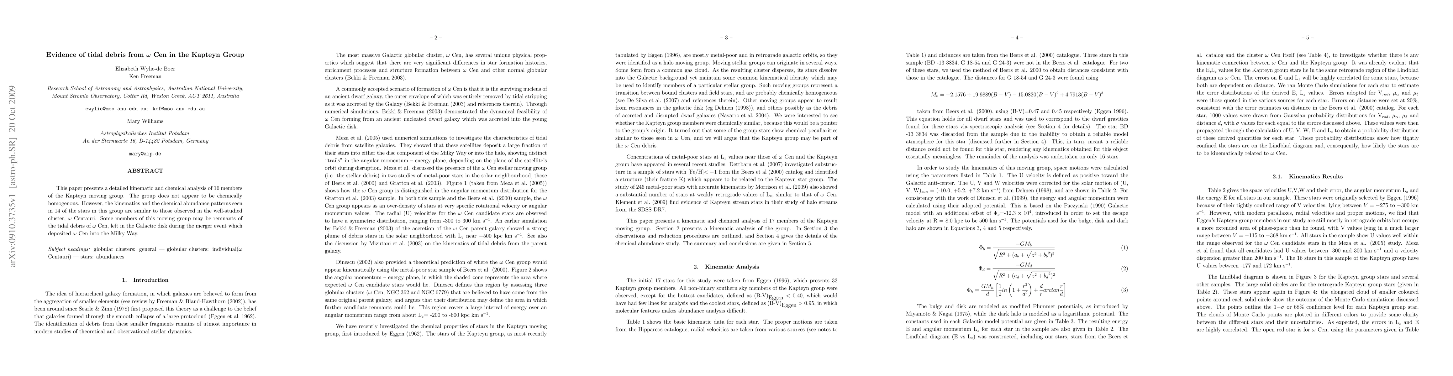 This paper identifies 14 members of the Kapteyn moving group with kinematics and chemical abundances similar to Omega Centauri, suggesting they may be tidal debris from the cluster dispersed in the Galactic disk. The Kapteyn group shows chemical heterogeneity, indicating complex formation and interaction history.
