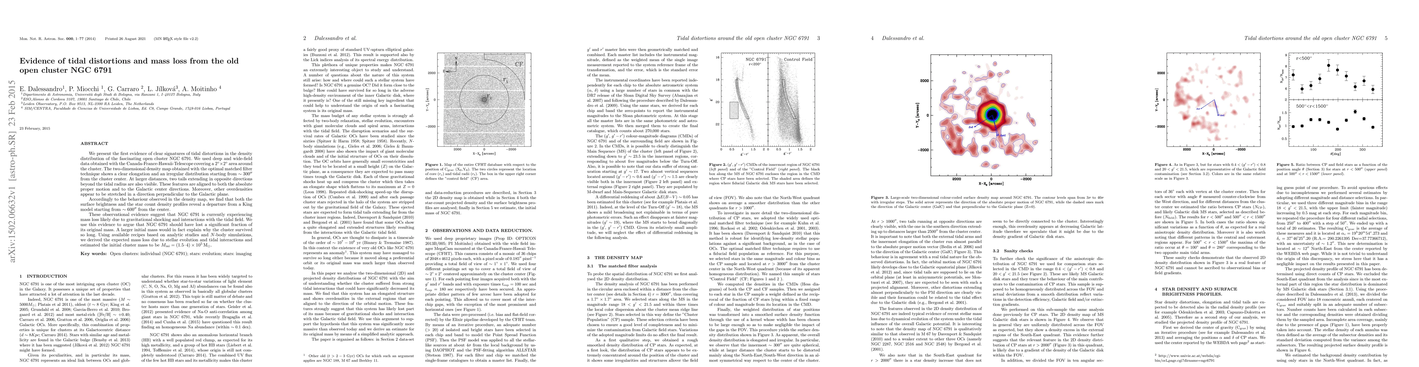 We present the first evidence of clear signatures of tidal distortions in the density distribution of the fascinating open cluster NGC 6791. We used deep and wide-field data obtained with the Canada-France-Hawaii-Telescope covering a 2x2 square degrees area around the cluster. The two-dimensional density map obtained with the optimal matched filter technique shows a clear elongation and an irregular distribution starting from ~300" from the cluster center. At larger distances, two tails extending in opposite directions beyond the tidal radius are also visible. These features are aligned to both the absolute proper motion and to the Galactic center directions. Moreover, other overdensities appear to be stretched in a direction perpendicular to the Galactic plane. Accordingly to the behaviour observed in the density map, we find that both the surface brightness and the star count density profiles reveal a departure from a King model starting from ~600" from the center. These observational evidence suggest that NGC 6791 is currently experiencing mass loss likely due to gravitational shocking and interactions with the tidal field. We use this evidence to argue that NGC 6791 should have lost a significant fraction of its original mass. A larger initial mass would in fact explain why the cluster survived so long. Using available recipes based on analytic studies and N-body simulations, we derived the expected mass loss due to stellar evolution and tidal interactions and estimated the initial cluster mass to be M_ini=(1.5-4) x 10^5 M_sun.