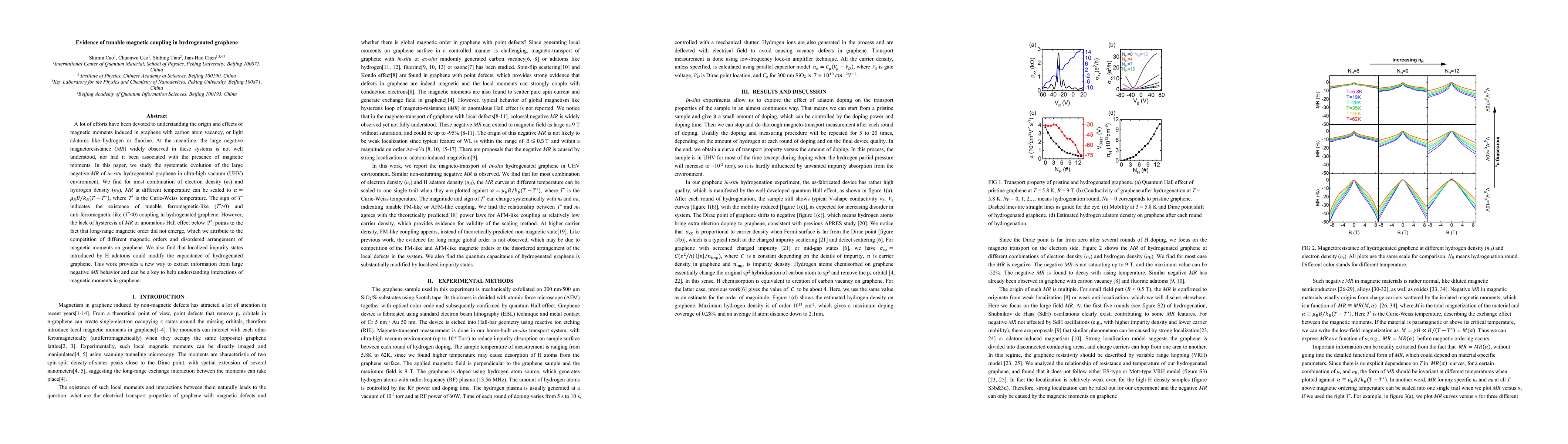 This research investigates the tunable magnetic coupling in hydrogenated graphene, finding that large negative magnetoresistance (MR) can indicate ferromagnetic-like or anti-ferromagnetic-like interactions, though no long-range magnetic order emerges due to competition among magnetic orders and disorder. The presence of H adatoms also modifies graphene's capacitance.