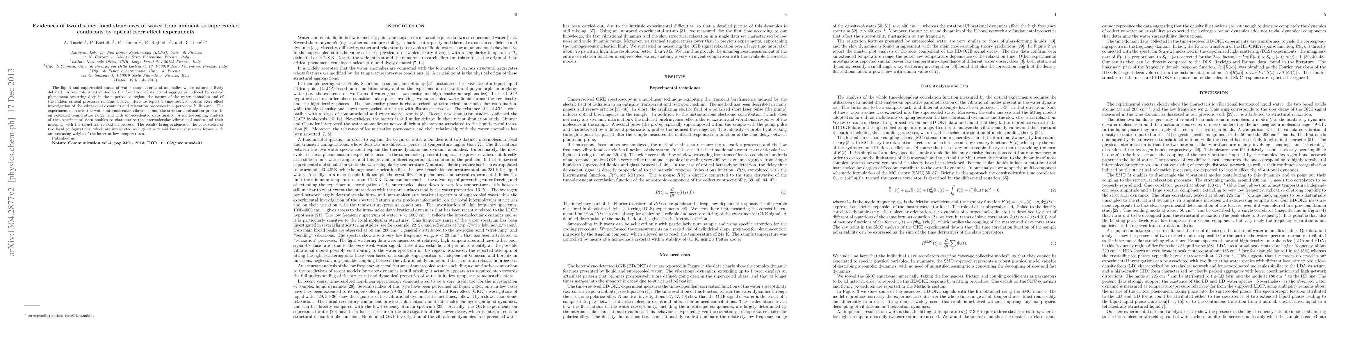This study reveals two distinct local structures of water through a time-resolved optical Kerr effect investigation, identifying high-density and low-density configurations that become more prevalent in supercooled water. The findings suggest a deeper understanding of water's anomalous behavior and its hidden critical phenomena.