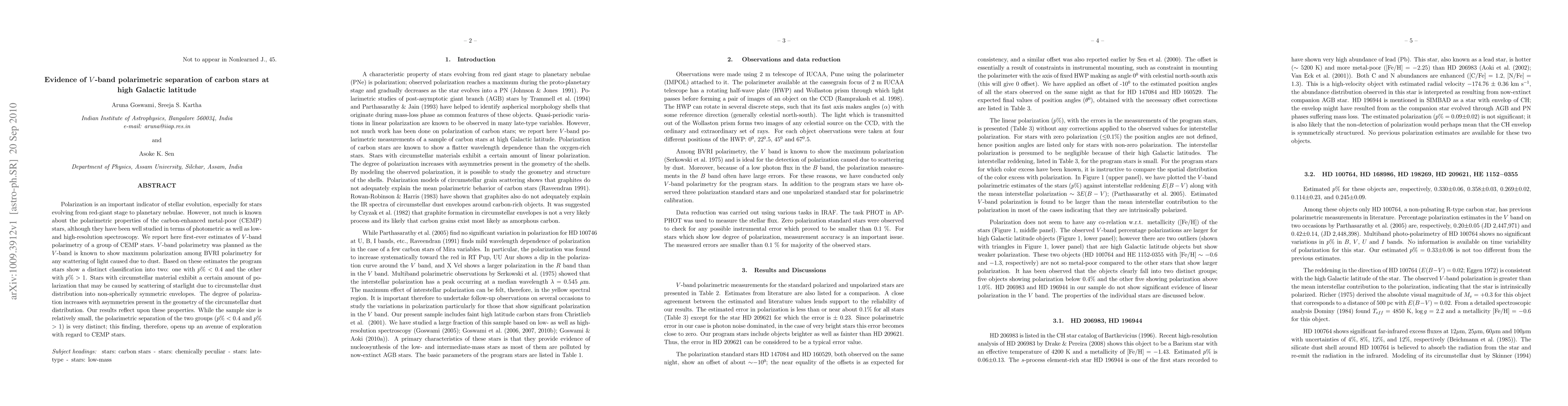 Polarization is an important indicator of stellar evolution, especially for stars evolving from red-giant stage to planetary nebulae. However, not much is known about the polarimetric properties of the carbon-enhanced metal-poor (CEMP) stars, although they have been well studied in terms of photometric as well as low- and high-resolution spectroscopy. We report here first-ever estimates of V-band polarimetry of a group of CEMP stars. V-band polarimetry was planned as the V-band is known to show maximum polarization among BVRI polarimetry for any scattering of light caused due to dust. Based on these estimates the program stars show a distinct classification into two: one with p% < 0.4 and the other with p% > 1. Stars with circumstellar material exhibit a certain amount of polarization that may be caused by scattering of starlight due to circumstellar dust distribution into non-spherically symmetric envelopes. The degree of polarization increases with asymmetries present in the geometry of the circumstellar dust distribution. Our results reflect upon these properties. While the sample size is relatively small, the polarimetric separation of the two groups (p% < 0.4 and p% > 1) is very distinct; this finding, therefore, opens up an avenue of exploration with regard to CEMP stars.