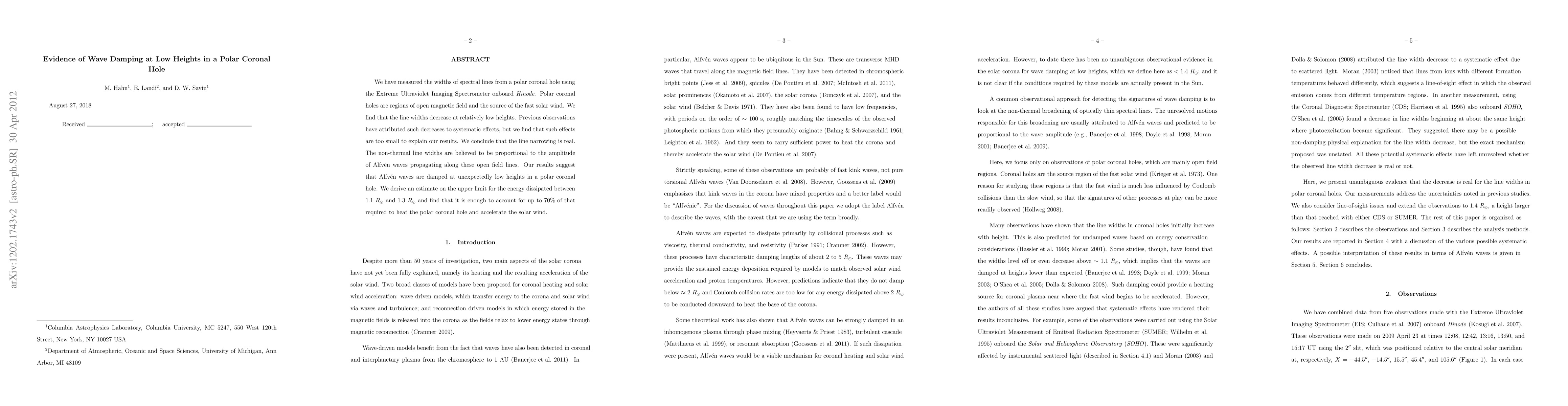 We have measured the widths of spectral lines from a polar coronal hole using the Extreme Ultraviolet Imaging Spectrometer onboard Hinode. Polar coronal holes are regions of open magnetic field and the source of the fast solar wind. We find that the line widths decrease at relatively low heights. Previous observations have attributed such decreases to systematic effects, but we find that such effects are too small to explain our results. We conclude that the line narrowing is real. The non-thermal line widths are believed to be proportional to the amplitude of Alfven waves propagating along these open field lines. Our results suggest that Alfven waves are damped at unexpectedly low heights in a polar coronal hole. We derive an estimate on the upper limit for the energy dissipated between 1.1 and 1.3 solar radii and find that it is enough to account for up to 70% of that required to heat the polar coronal hole and accelerate the solar wind.