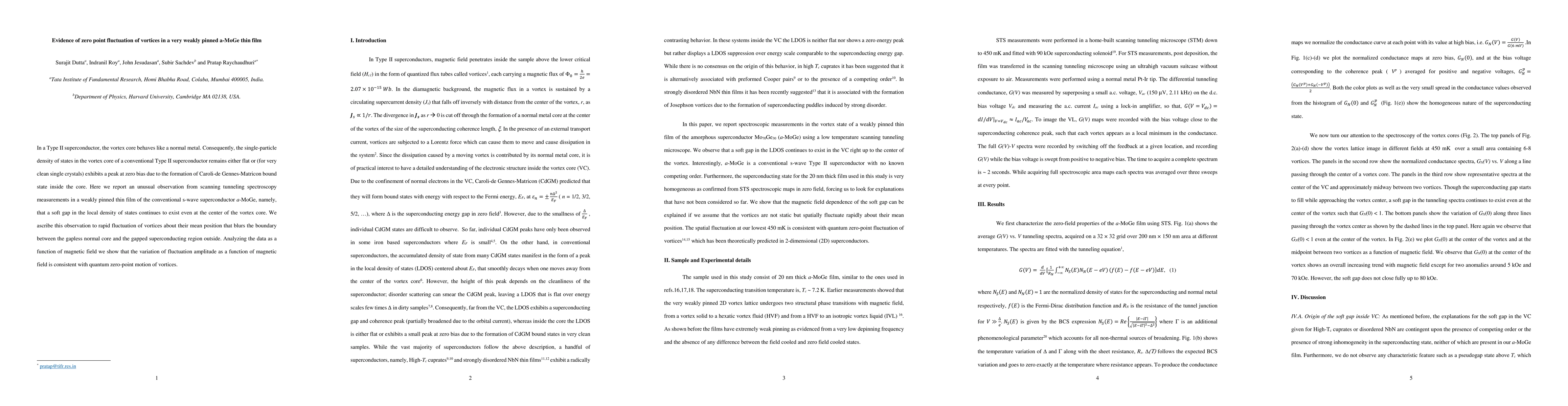 This study reveals that in a weakly pinned a-MoGe thin film, vortex cores maintain a soft gap in local density of states, contrary to conventional Type II superconductors. This phenomenon is attributed to zero-point fluctuations of vortices, blurring the core's boundary and aligning with quantum zero-point motion.