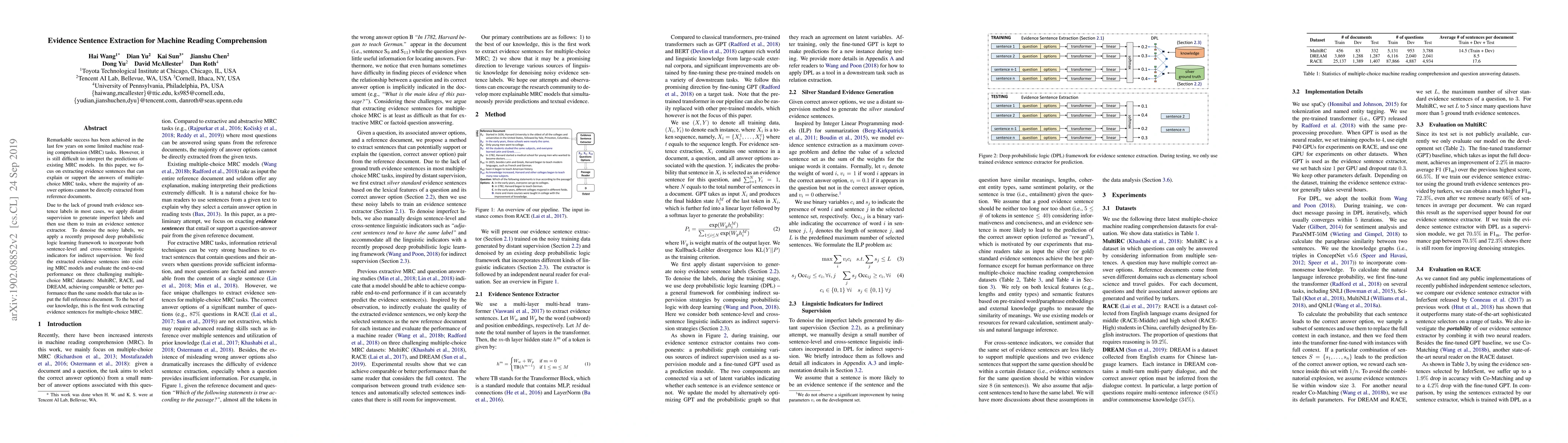 Remarkable success has been achieved in the last few years on some limited machine reading comprehension (MRC) tasks. However, it is still difficult to interpret the predictions of existing MRC models. In this paper, we focus on extracting evidence sentences that can explain or support the answers of multiple-choice MRC tasks, where the majority of answer options cannot be directly extracted from reference documents. Due to the lack of ground truth evidence sentence labels in most cases, we apply distant supervision to generate imperfect labels and then use them to train an evidence sentence extractor. To denoise the noisy labels, we apply a recently proposed deep probabilistic logic learning framework to incorporate both sentence-level and cross-sentence linguistic indicators for indirect supervision. We feed the extracted evidence sentences into existing MRC models and evaluate the end-to-end performance on three challenging multiple-choice MRC datasets: MultiRC, RACE, and DREAM, achieving comparable or better performance than the same models that take as input the full reference document. To the best of our knowledge, this is the first work extracting evidence sentences for multiple-choice MRC.