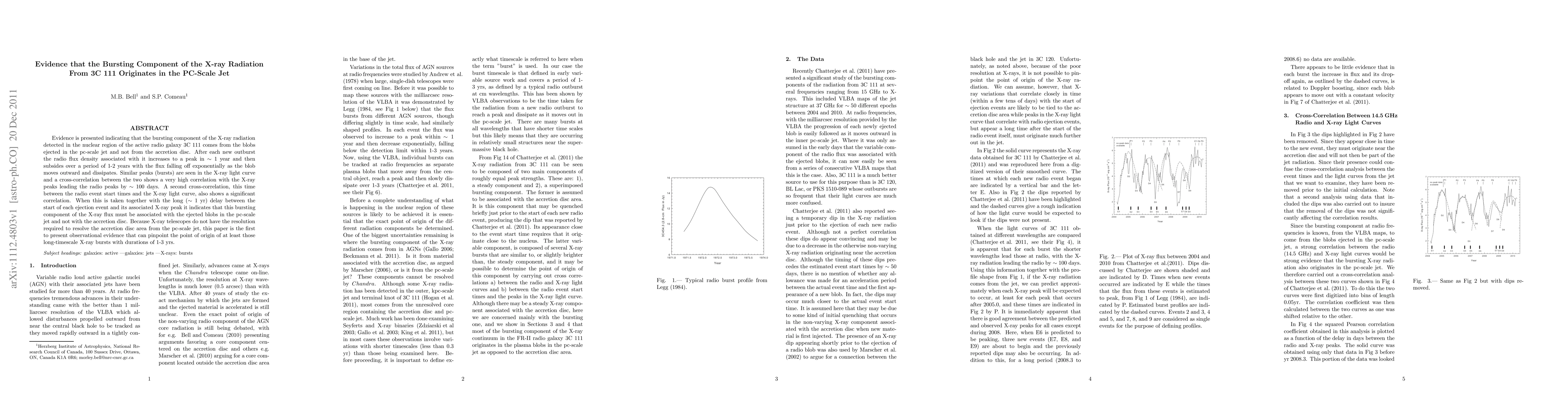 The paper presents observational evidence that the bursting component of X-ray radiation from active radio galaxy 3C 111 originates from pc-scale jet blobs, not the accretion disc. High correlation between X-ray bursts and radio outbursts, with X-ray peaks leading by ~100 days, supports this. This marks the first identification of the origin of long-timescale X-ray bursts in such galaxies.