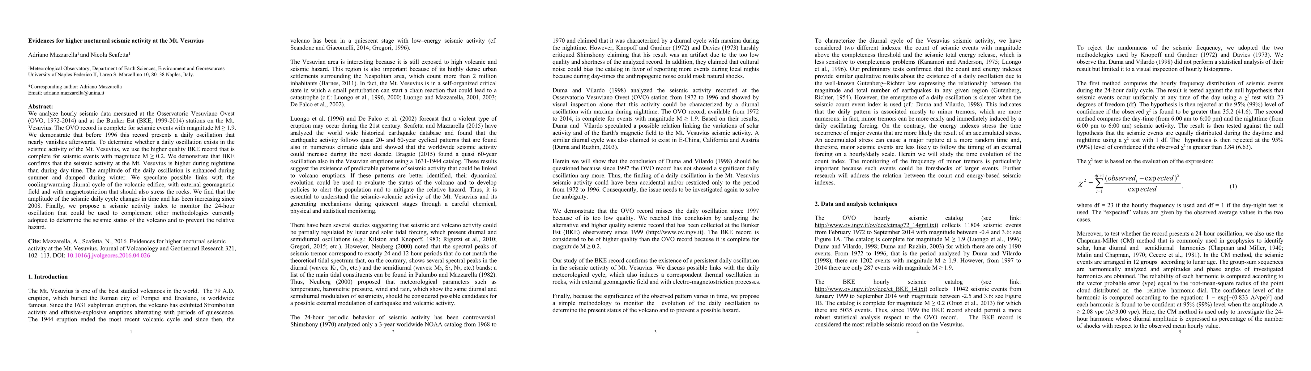 This study analyzes seismic data from Mt. Vesuvius, showing higher nocturnal seismic activity confirmed by the BKE station. The amplitude of this daily oscillation varies seasonally and has been increasing since 2008, potentially linked to volcanic cooling/warming cycles, geomagnetic fields, and rock stress.