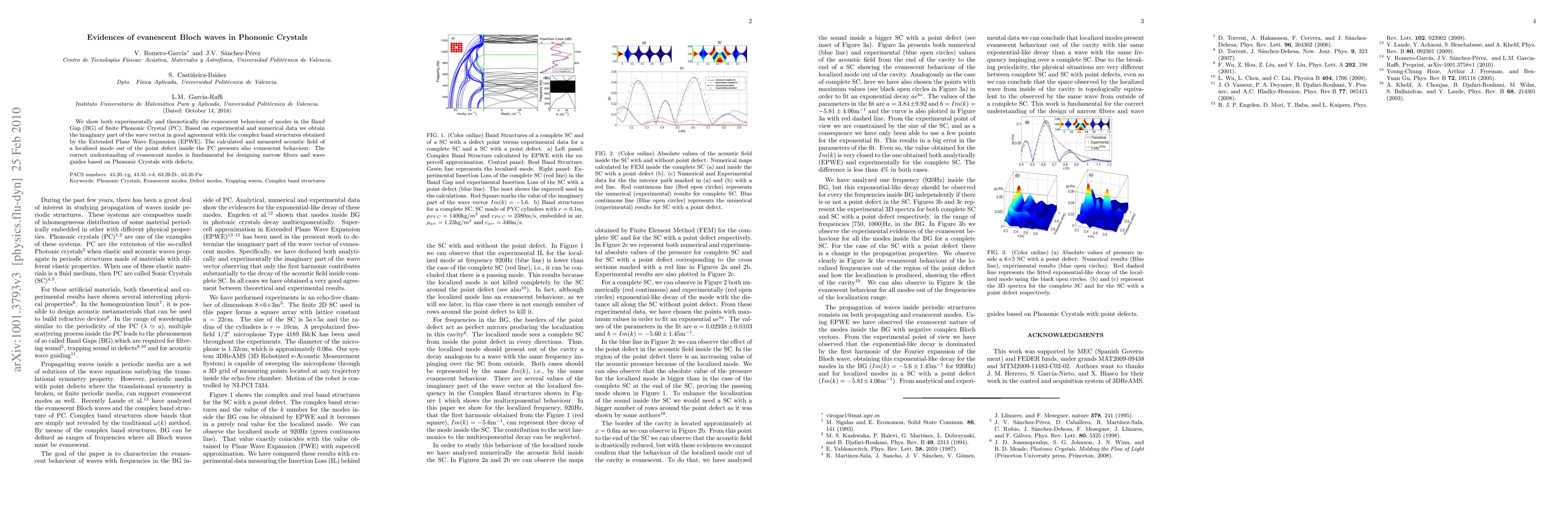 We show both experimentally and theoretically the evanescent behaviour of modes in the Band Gap (BG) of finite Phononic Crystal (PC). Based on experimental and numerical data we obtain the imaginary part of the wave vector in good agreement with the complex band structures obtained by the Extended Plane Wave Expansion (EPWE). The calculated and measured acoustic field of a localized mode out of the point defect inside the PC presents also evanescent behaviour. The correct understanding of evanescent modes is fundamental for designing narrow filters and wave guides based on Phononic Crystals with defects.