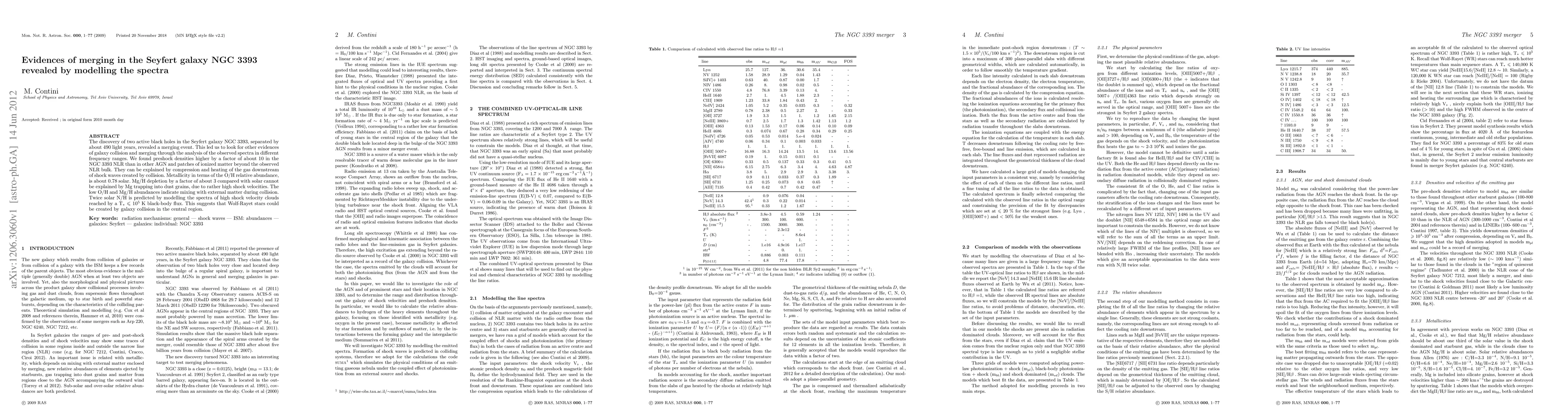 The discovery of two active black holes in the Seyfert galaxy NGC 3393, separated by about 490 light years, revealed a merging event. This led us to look for other evidences of galaxy collision and merging through the analysis of the observed spectra in different frequency ranges. We found preshock densities higher by a factor of about 10 in the NGC 3393 NLR than in other AGN and patches of ionized matter beyond the observed NLR bulk. They can be explained by compression and heating of the gas downstream of shock waves created by collision. Metallicity in terms of the O/H relative abundance, is about 0.78 solar. Mg/H depletion by a factor of about 3 compared with solar cannot be explained by Mg trapping into dust grains, due to rather high shock velocities. The low O/H and Mg/H abundances indicate mixing with external matter during collision. Twice solar N/H is predicted by modelling the spectra of high shock velocity clouds reached by a Ts =8.6 10^4 K black-body flux. This suggests that Wolf-Rayet stars could be created by galaxy collision in the central region.