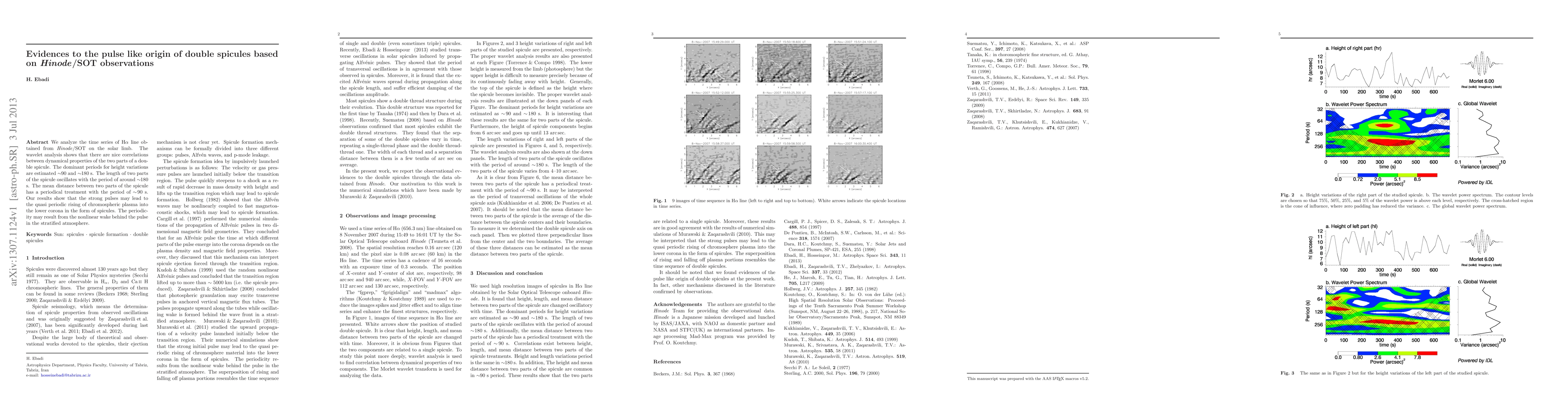 This study uses Hinode/SOT observations to analyze the H$\alpha$ line time series, revealing that the double spicule's parts exhibit correlated dynamical properties with dominant periods of ~90 and ~180 seconds, suggesting a pulse-like origin for the spicule's periodic behavior. The findings indicate that strong pulses drive the quasi-periodic rise of chromospheric plasma into the lower corona.