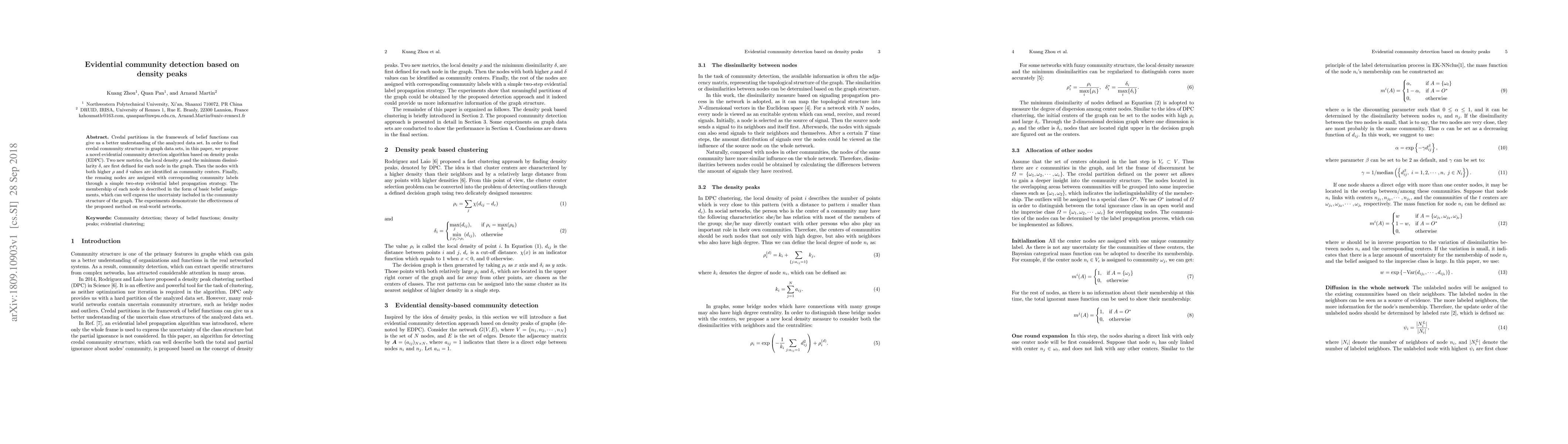 This paper proposes a novel evidential community detection algorithm (EDPC) based on density peaks to identify credal community structures in graph data. It introduces two new metrics, local density and minimum dissimilarity, to identify community centers and employs an evidential label propagation strategy to assign nodes, expressing membership uncertainty through basic belief assignments. Experiments show the method's effectiveness on real-world networks.