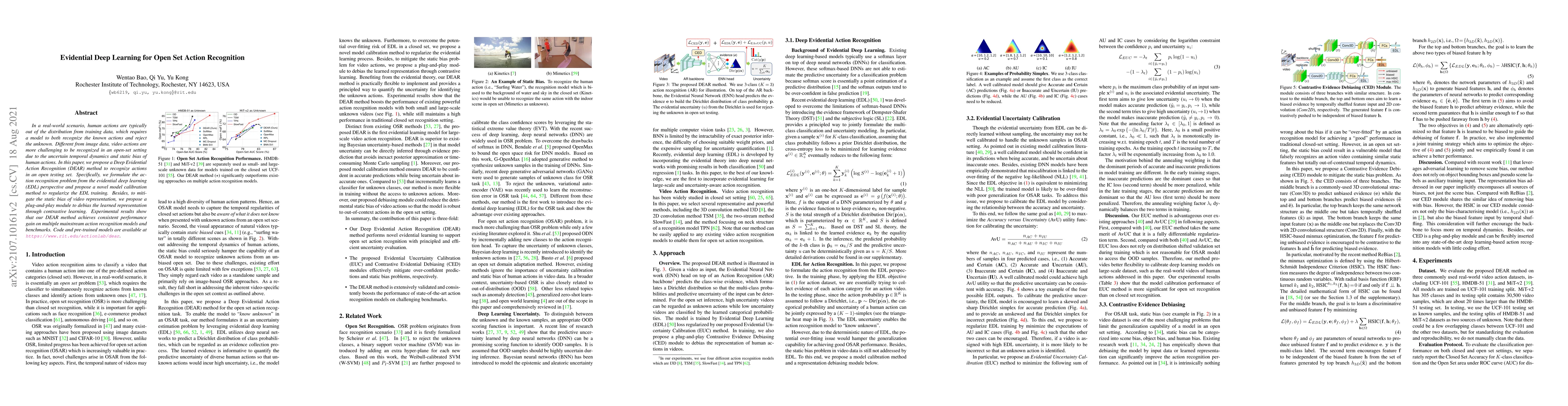In a real-world scenario, human actions are typically out of the distribution from training data, which requires a model to both recognize the known actions and reject the unknown. Different from image data, video actions are more challenging to be recognized in an open-set setting due to the uncertain temporal dynamics and static bias of human actions. In this paper, we propose a Deep Evidential Action Recognition (DEAR) method to recognize actions in an open testing set. Specifically, we formulate the action recognition problem from the evidential deep learning (EDL) perspective and propose a novel model calibration method to regularize the EDL training. Besides, to mitigate the static bias of video representation, we propose a plug-and-play module to debias the learned representation through contrastive learning. Experimental results show that our DEAR method achieves consistent performance gain on multiple mainstream action recognition models and benchmarks. Code and pre-trained models are available at {\small{\url{https://www.rit.edu/actionlab/dear}}}.
