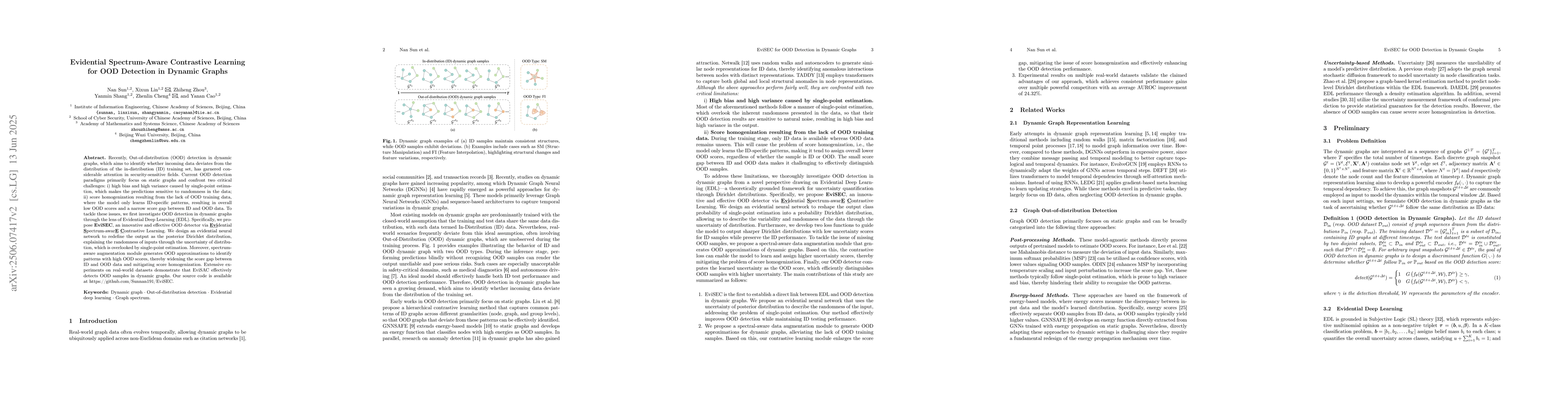 The research proposes EviSEC, an OOD detection framework for dynamic graphs that combines a flexible dynamic graph encoder with an evidential neural network, addressing the limitations of single-point estimation. It introduces a spectrum-aware contrastive learning strategy to mitigate score homogenization and designs an OOD detector based on uncertainty scores.