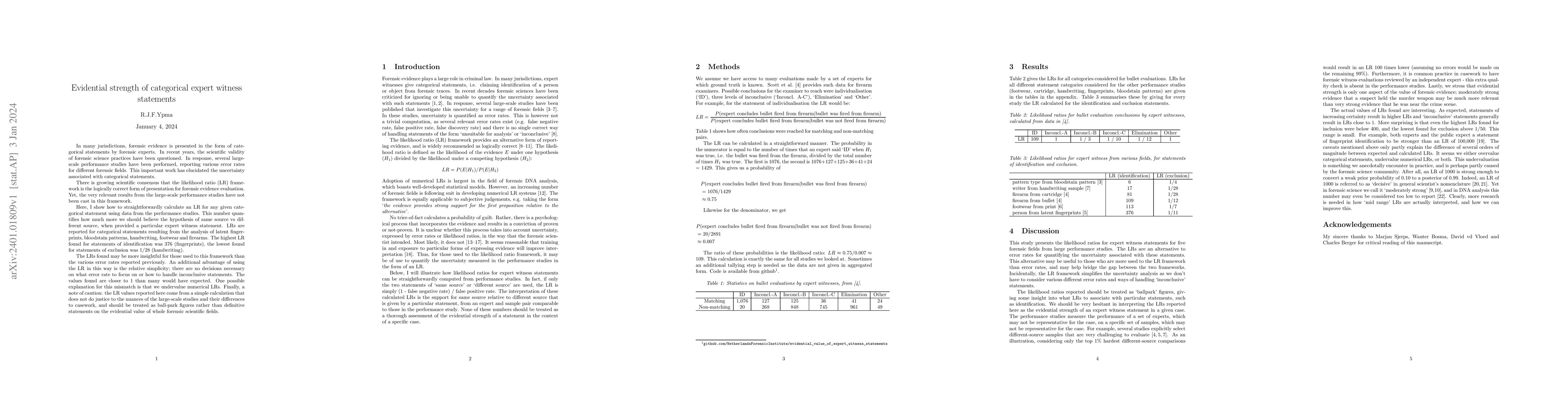 This paper demonstrates how to convert error rates from large-scale forensic performance studies into likelihood ratios (LRs) to better evaluate the evidential strength of categorical expert witness statements. The calculated LRs suggest that the evidential value of forensic identifications is closer to 1 than expected, but caution that these figures are approximate and do not fully capture the complexities of real-case scenarios.