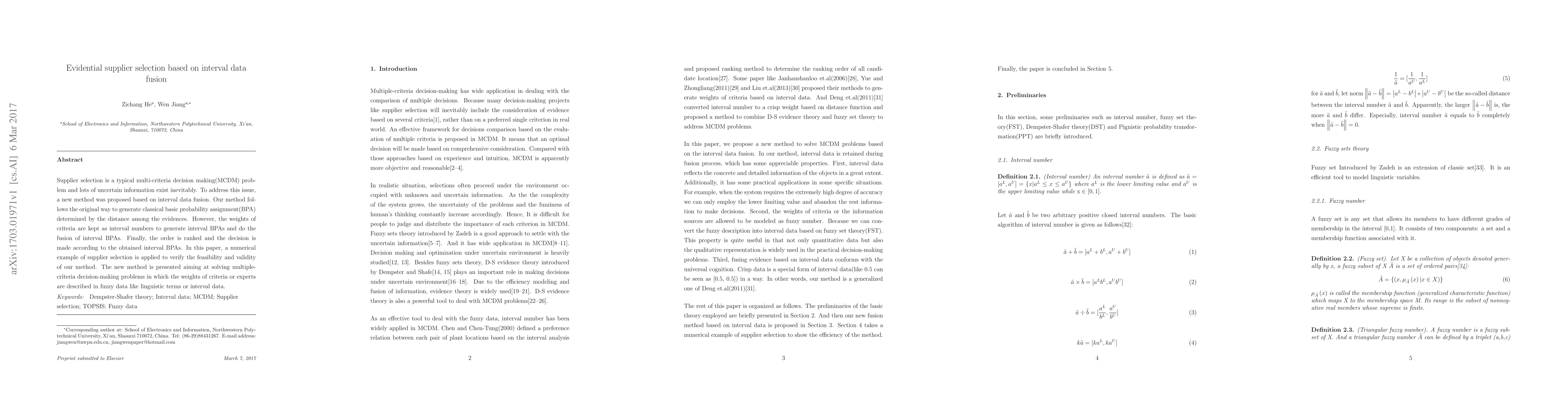 Supplier selection is a typical multi-criteria decision making (MCDM) problem and lots of uncertain information exist inevitably. To address this issue, a new method was proposed based on interval data fusion. Our method follows the original way to generate classical basic probability assignment(BPA) determined by the distance among the evidences. However, the weights of criteria are kept as interval numbers to generate interval BPAs and do the fusion of interval BPAs. Finally, the order is ranked and the decision is made according to the obtained interval BPAs. In this paper, a numerical example of supplier selection is applied to verify the feasibility and validity of our method. The new method is presented aiming at solving multiple-criteria decision-making problems in which the weights of criteria or experts are described in fuzzy data like linguistic terms or interval data.