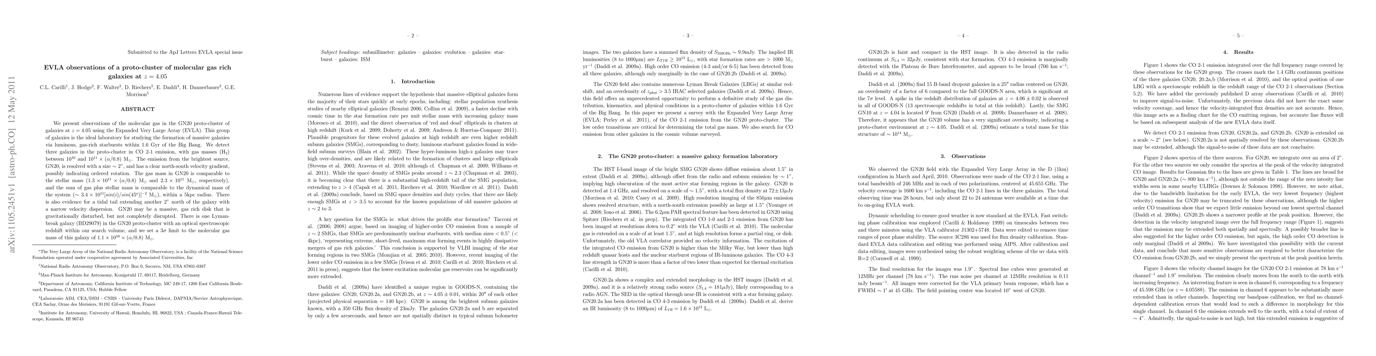 We present observations of the molecular gas in the GN20 proto-cluster of galaxies at $z =4.05$ using the Expanded Very Large Array (EVLA). This group of galaxies is the ideal laboratory for studying the formation of massive galaxies via luminous, gas-rich starbursts within 1.6 Gyr of the Big Bang. We detect three galaxies in the proto-cluster in CO 2-1 emission, with gas masses (H$_2$) between $10^{10}$ and $10^{11} \times (\alpha/0.8)$ M$_\odot$. The emission from the brightest source, GN20, is resolved with a size $\sim 2"$, and has a clear north-south velocity gradient, possibly indicating ordered rotation. The gas mass in GN20 is comparable to the stellar mass ($1.3\times 10^{11} \times (\alpha/0.8)$ M$_\odot$ and $2.3\times 10^{11}$ M$_\odot$, respectively), and the sum of gas plus stellar mass is comparable to the dynamical mass of the system ($\sim 3.4\times 10^{11} [sin(i)/sin(45^o)]^{-2}$ M$_\odot$), within a 5kpc radius. There is also evidence for a tidal tail extending another $2"$ north of the galaxy with a narrow velocity dispersion. GN20 may be a massive, gas rich disk that is gravitationally disturbed, but not completely disrupted. There is one Lyman-break galaxy (BD29079) in the GN20 proto-cluster with an optical spectroscopic redshift within our search volume, and we set a 3$\sigma$ limit to the molecular gas mass of this galaxy of $1.1\times 10^{10} \times (\alpha/0.8)$ M$_\odot$.