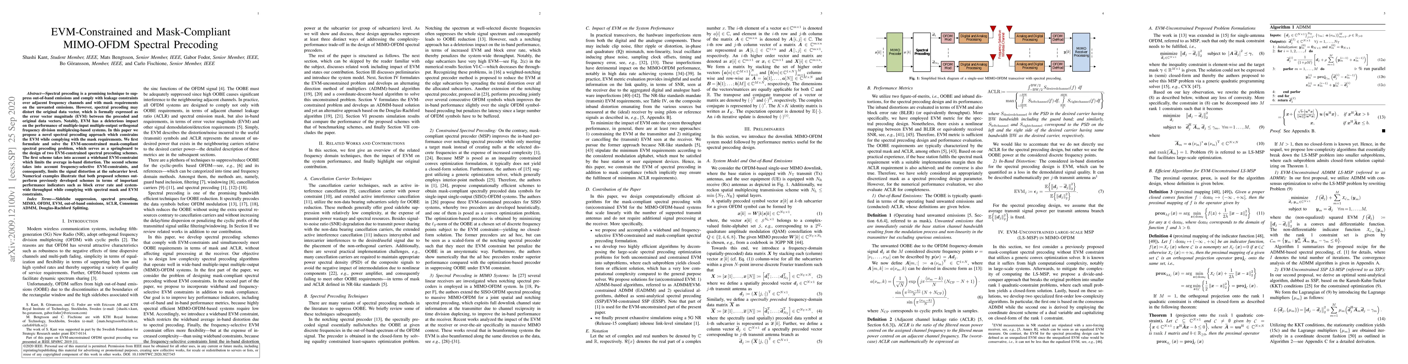 This paper proposes novel spectral precoding methods to suppress out-of-band emissions while adhering to spectral mask requirements and minimizing error vector magnitude (EVM) distortion in MIMO-OFDM systems. The proposed schemes outperform existing methods in terms of block error rate and throughput.