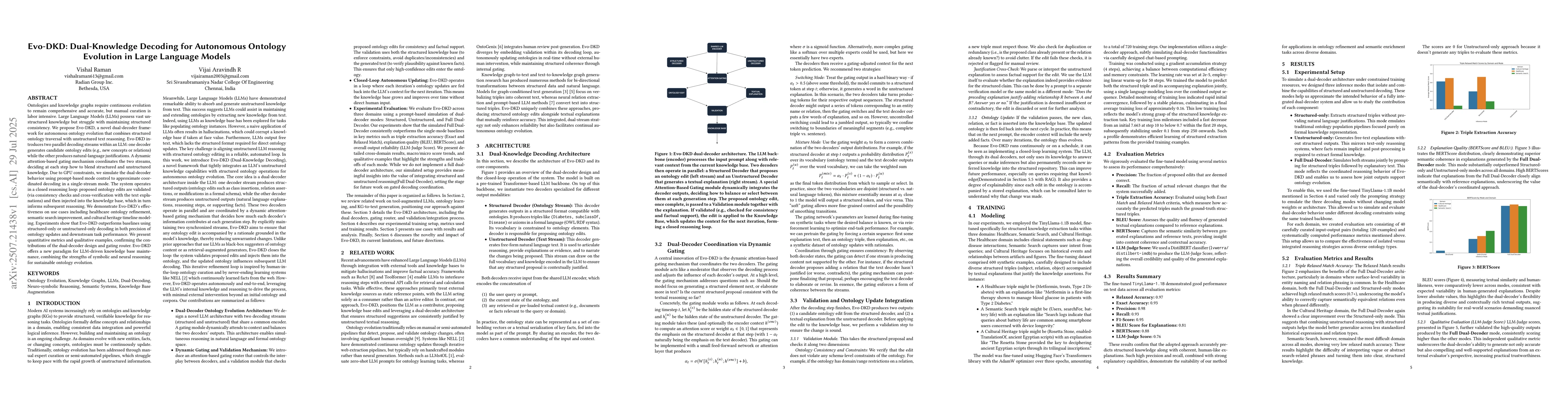 Ontologies and knowledge graphs require continuous evolution to remain comprehensive and accurate, but manual curation is labor intensive. Large Language Models (LLMs) possess vast unstructured knowledge but struggle with maintaining structured consistency. We propose Evo-DKD, a novel dual-decoder framework for autonomous ontology evolution that combines structured ontology traversal with unstructured text reasoning. Evo-DKD introduces two parallel decoding streams within an LLM: one decoder generates candidate ontology edits (e.g., new concepts or relations) while the other produces natural-language justifications. A dynamic attention-based gating mechanism coordinates the two streams, deciding at each step how to blend structured and unstructured knowledge. Due to GPU constraints, we simulate the dual-decoder behavior using prompt-based mode control to approximate coordinated decoding in a single-stream mode. The system operates in a closed reasoning loop: proposed ontology edits are validated (via consistency checks and cross-verification with the text explanations) and then injected into the knowledge base, which in turn informs subsequent reasoning. We demonstrate Evo-DKD's effectiveness on use cases including healthcare ontology refinement, semantic search improvement, and cultural heritage timeline modeling. Experiments show that Evo-DKD outperforms baselines using structured-only or unstructured-only decoding in both precision of ontology updates and downstream task performance. We present quantitative metrics and qualitative examples, confirming the contributions of the dual-decoder design and gating router. Evo-DKD offers a new paradigm for LLM-driven knowledge base maintenance, combining the strengths of symbolic and neural reasoning for sustainable ontology evolution.
