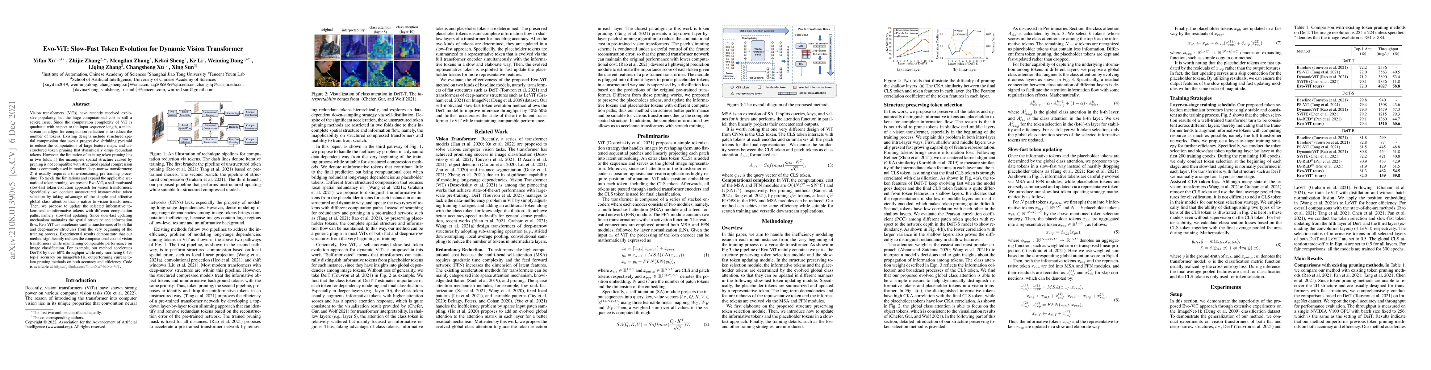 Evo-ViT introduces a self-motivated slow-fast token evolution method for vision transformers, addressing the limitations of existing token pruning techniques by maintaining spatial structure and reducing computational cost through dynamic token selection and updating. This approach enables efficient training and comparable performance in image classification tasks.