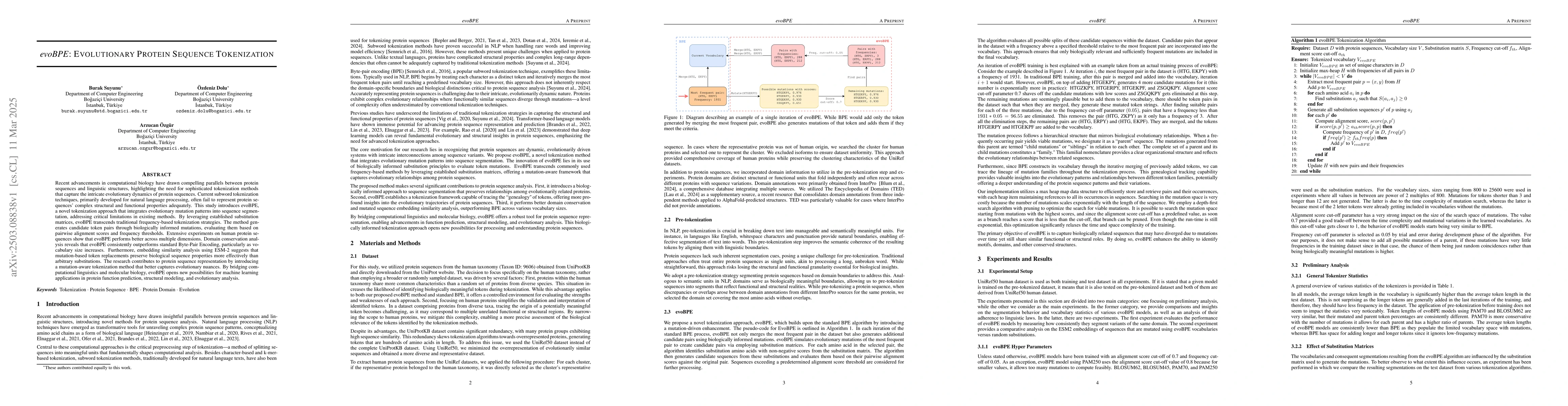 Recent advancements in computational biology have drawn compelling parallels between protein sequences and linguistic structures, highlighting the need for sophisticated tokenization methods that capture the intricate evolutionary dynamics of protein sequences. Current subword tokenization techniques, primarily developed for natural language processing, often fail to represent protein sequences' complex structural and functional properties adequately. This study introduces evoBPE, a novel tokenization approach that integrates evolutionary mutation patterns into sequence segmentation, addressing critical limitations in existing methods. By leveraging established substitution matrices, evoBPE transcends traditional frequency-based tokenization strategies. The method generates candidate token pairs through biologically informed mutations, evaluating them based on pairwise alignment scores and frequency thresholds. Extensive experiments on human protein sequences show that evoBPE performs better across multiple dimensions. Domain conservation analysis reveals that evoBPE consistently outperforms standard Byte-Pair Encoding, particularly as vocabulary size increases. Furthermore, embedding similarity analysis using ESM-2 suggests that mutation-based token replacements preserve biological sequence properties more effectively than arbitrary substitutions. The research contributes to protein sequence representation by introducing a mutation-aware tokenization method that better captures evolutionary nuances. By bridging computational linguistics and molecular biology, evoBPE opens new possibilities for machine learning applications in protein function prediction, structural modeling, and evolutionary analysis.
