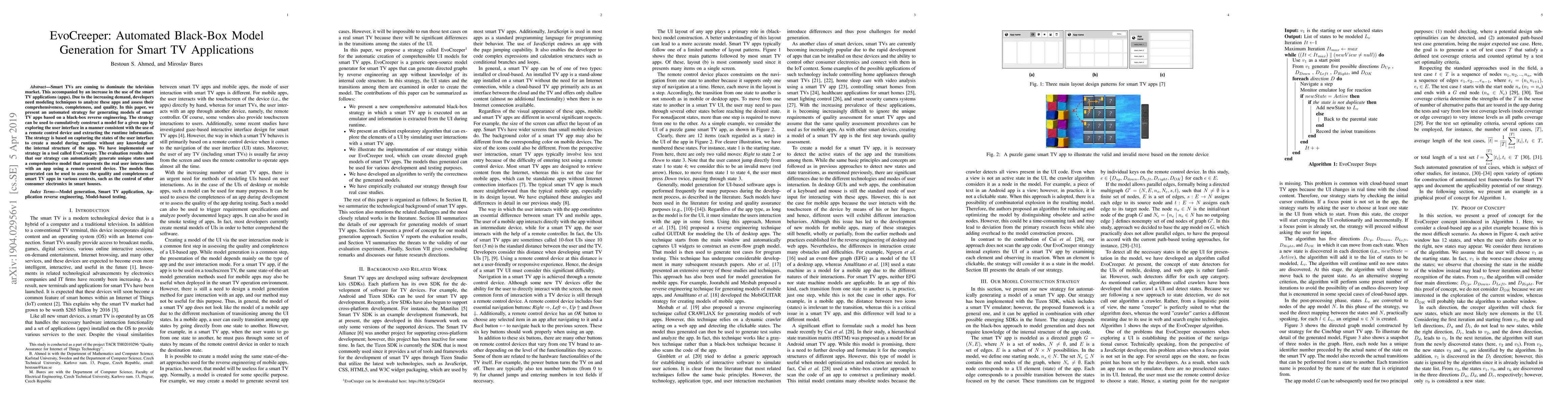 This paper presents EvoCreeper, an automated black-box model generation tool for smart TV applications, which constructs comprehensive models by exploring user interfaces and extracting runtime information without internal app knowledge. The tool's evaluation demonstrates its ability to generate accurate models representing real user interactions with remote control usage.