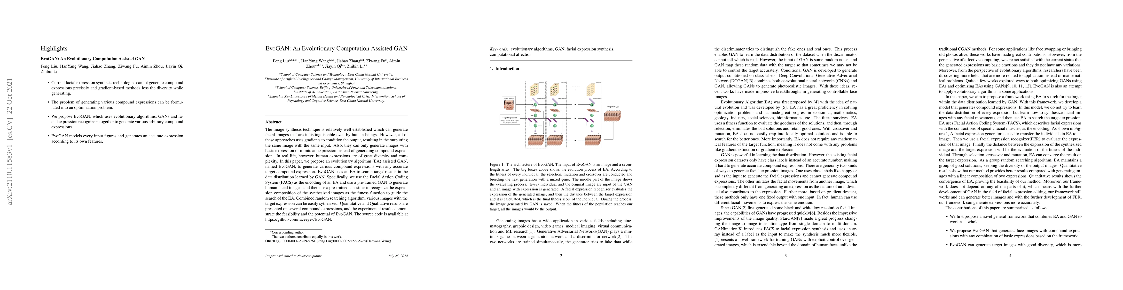 The image synthesis technique is relatively well established which can generate facial images that are indistinguishable even by human beings. However, all of these approaches uses gradients to condition the output, resulting in the outputting the same image with the same input. Also, they can only generate images with basic expression or mimic an expression instead of generating compound expression. In real life, however, human expressions are of great diversity and complexity. In this paper, we propose an evolutionary algorithm (EA) assisted GAN, named EvoGAN, to generate various compound expressions with any accurate target compound expression. EvoGAN uses an EA to search target results in the data distribution learned by GAN. Specifically, we use the Facial Action Coding System (FACS) as the encoding of an EA and use a pre-trained GAN to generate human facial images, and then use a pre-trained classifier to recognize the expression composition of the synthesized images as the fitness function to guide the search of the EA. Combined random searching algorithm, various images with the target expression can be easily sythesized. Quantitative and Qualitative results are presented on several compound expressions, and the experimental results demonstrate the feasibility and the potential of EvoGAN.
