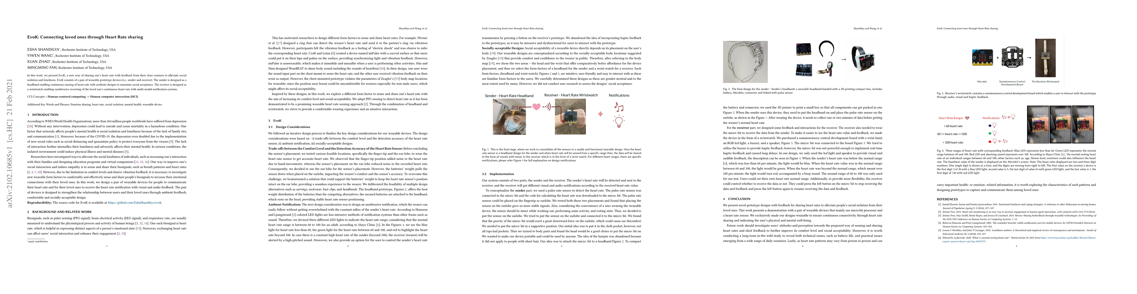 In this work, we present EvoK, a new way of sharing one's heart rate with feedback from their close contacts to alleviate social isolation and loneliness. EvoK consists of a pair of wearable prototype devices (i.e., sender and receiver). The sender is designed as a headband enabling continuous sensing of heart rate with aesthetic designs to maximize social acceptance. The receiver is designed as a wristwatch enabling unobtrusive receiving of the loved one's continuous heart rate with multi-modal notification systems.