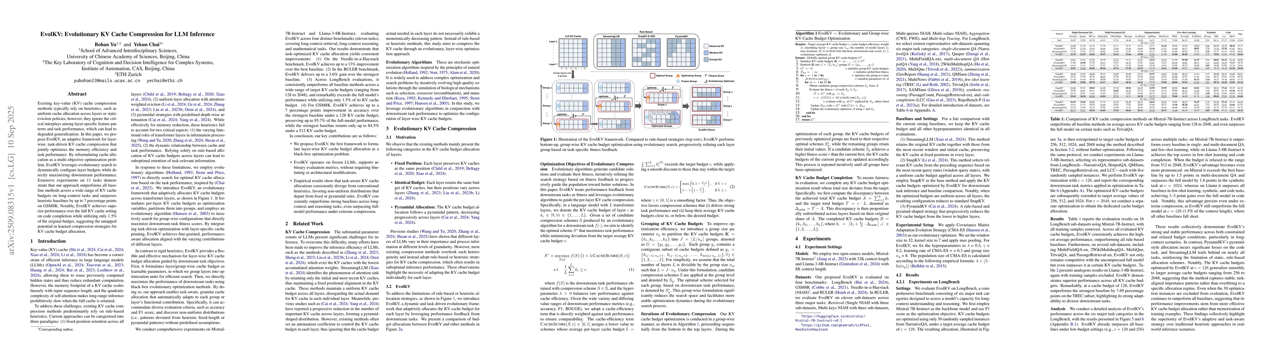 Existing key-value (KV) cache compression methods typically rely on heuristics, such as uniform cache allocation across layers or static eviction policies, however, they ignore the critical interplays among layer-specific feature patterns and task performance, which can lead to degraded generalization. In this paper, we propose EvolKV, an adaptive framework for layer-wise, task-driven KV cache compression that jointly optimizes the memory efficiency and task performance. By reformulating cache allocation as a multi-objective optimization problem, EvolKV leverages evolutionary search to dynamically configure layer budgets while directly maximizing downstream performance. Extensive experiments on 11 tasks demonstrate that our approach outperforms all baseline methods across a wide range of KV cache budgets on long-context tasks and surpasses heuristic baselines by up to 7 percentage points on GSM8K. Notably, EvolKV achieves superior performance over the full KV cache setting on code completion while utilizing only 1.5% of the original budget, suggesting the untapped potential in learned compression strategies for KV cache budget allocation.