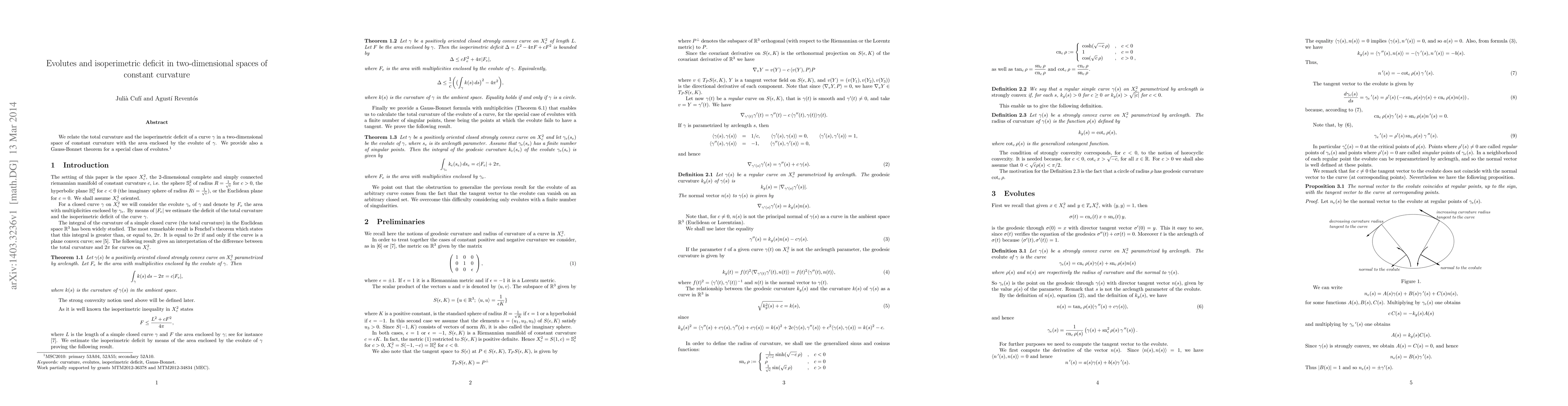 We relate the total curvature and the isoperimetric deficit of a curve $\gamma$ in a two-dimensional space of constant curvature with the area enclosed by the evolute of $\gamma$. We provide also a Gauss-Bonnet theorem for a special class of evolutes.