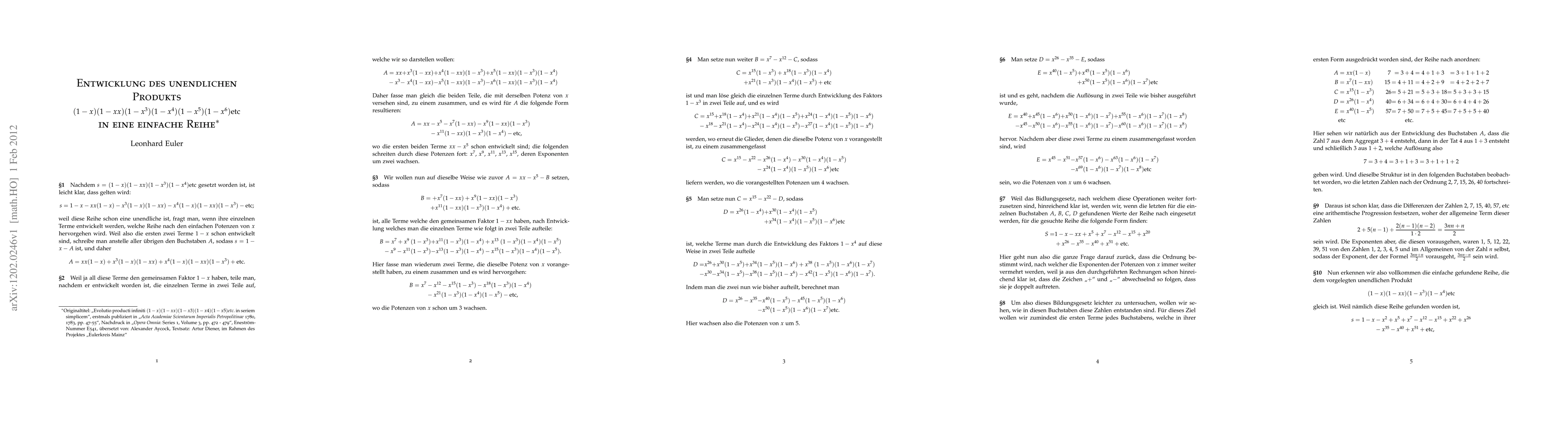 This paper does exactly what the title says it does. It expands the given series to arrive at the familiar "pentagonal number" expansion, also known as the pentagonal number theorem, and recalls its application to partition numbers. The paper is translated from Euler's Latin original into German.