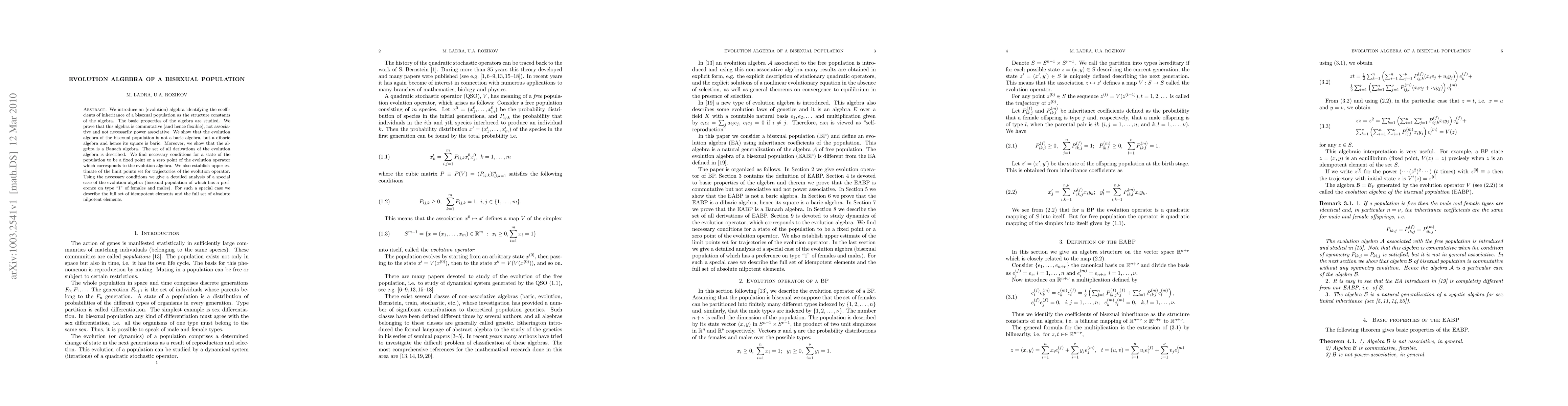 We introduce an (evolution) algebra identifying the coefficients of inheritance of a bisexual population as the structure constants of the algebra. The basic properties of the algebra are studied. We prove that this algebra is commutative (and hence flexible), not associative and not necessarily power associative. We show that the evolution algebra of the bisexual population is not a baric algebra, but a dibaric algebra and hence its square is baric. Moreover, we show that the algebra is a Banach algebra. The set of all derivations of the evolution algebra is described. We find necessary conditions for a state of the population to be a fixed point or a zero point of the evolution operator which corresponds to the evolution algebra. We also establish upper estimate of the limit points set for trajectories of the evolution operator. Using the necessary conditions we give a detailed analysis of a special case of the evolution algebra (bisexual population of which has a preference on type "1" of females and males). For such a special case we describe the full set of idempotent elements and the full set of absolute nilpotent elements.