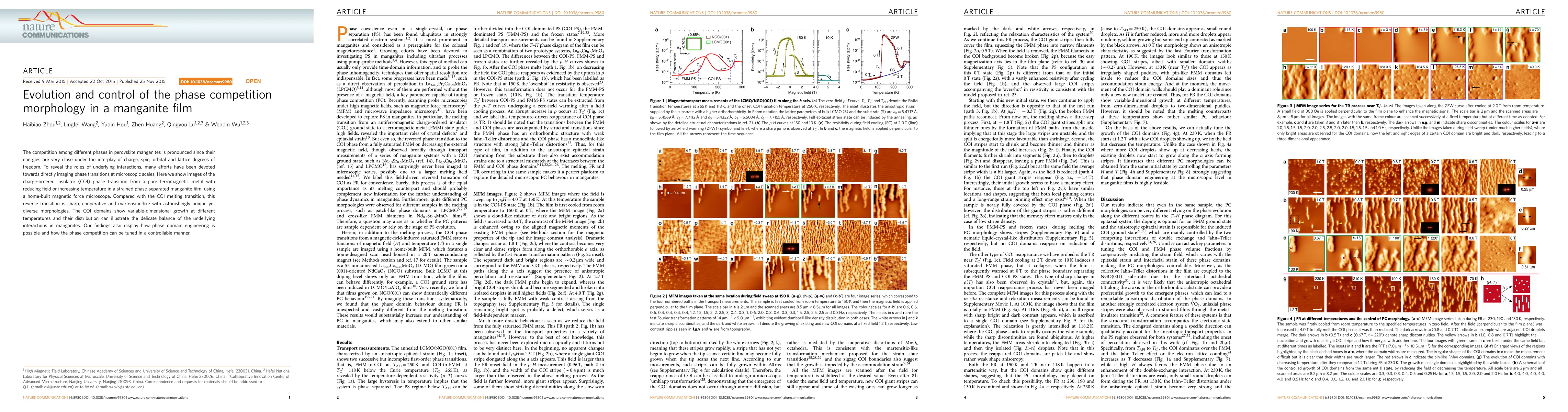 This paper investigates the phase competition in perovskite manganites using a magnetic force microscope, revealing sharp, cooperative, and martensitic-like transitions from a ferromagnetic metal to a charge-ordered insulator. The study demonstrates the tunable nature of phase domain engineering and the delicate balance of interactions in manganites.