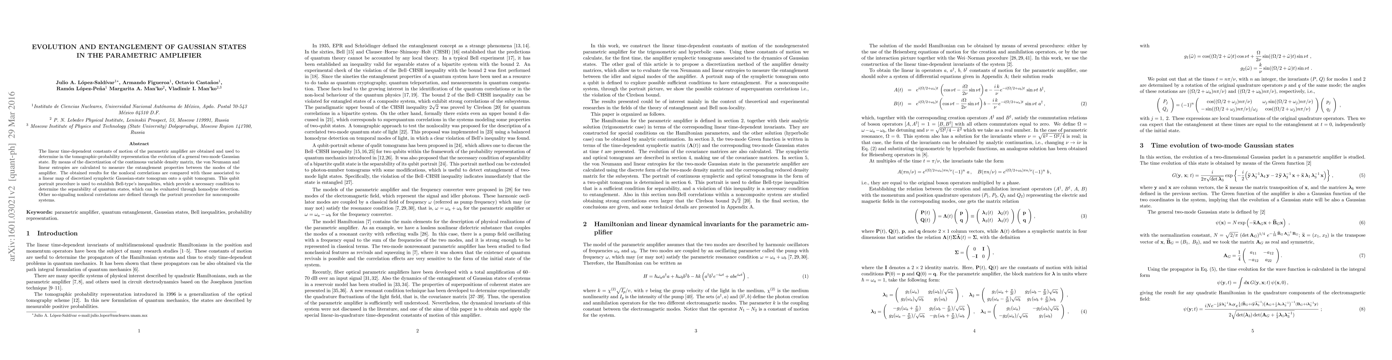 The linear time-dependent constants of motion of the parametric amplifier are obtained and used to determine in the tomographic-probability representation the evolution of a general two-mode Gaussian state. By means of the discretization of the continuous variable density matrix, the von Neumann and linear entropies are calculated to measure the entanglement properties between the modes of the amplifier. The obtained results for the nonlocal correlations are compared with those associated to a linear map of discretized symplectic Gaussian-state tomogram onto a qubit tomogram. This qubit portrait procedure is used to establish Bell-type's inequalities, which provide a necessary condition to determine the separability of quantum states, which can be evaluated through homodyne detection. Other no-signaling nonlocal correlations are defined through the portrait procedure for noncomposite systems.