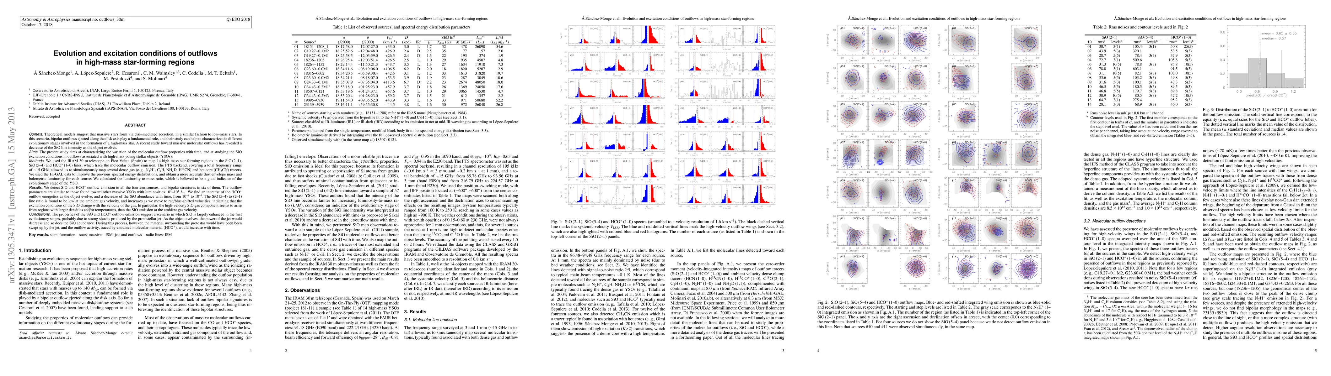 Theoretical models suggest that massive stars form via disk-mediated accretion, with bipolar outflows playing a fundamental role. A recent study toward massive molecular outflows has revealed a decrease of the SiO line intensity as the object evolves. The present study aims at characterizing the variation of the molecular outflow properties with time, and at studying the SiO excitation conditions in outflows associated with massive YSOs. We used the IRAM30m telescope to map 14 massive star-forming regions in the SiO(2-1), SiO(5-4) and HCO+(1-0) outflow lines, and in several dense gas and hot core tracers. Hi-GAL data was used to improve the spectral energy distributions and the L/M ratio, which is believed to be a good indicator of the evolutionary stage of the YSO. We detect SiO and HCO+ outflow emission in all the sources, and bipolar structures in six of them. The outflow parameters are similar to those found toward other massive YSOs. We find an increase of the HCO+ outflow energetics as the object evolve, and a decrease of the SiO abundance with time, from 10^(-8) to 10^(-9). The SiO(5-4) to (2-1) line ratio is found to be low at the ambient gas velocity, and increases as we move to high velocities, indicating that the excitation conditions of the SiO change with the velocity of the gas (with larger densities and/or temperatures for the high-velocity gas component). The properties of the SiO and HCO+ outflow emission suggest a scenario in which SiO is largely enhanced in the first evolutionary stages, probably due to strong shocks produced by the protostellar jet. As the object evolves, the power of the jet would decrease and so does the SiO abundance. During this process, however, the material surrounding the protostar would have been been swept up by the jet, and the outflow activity, traced by entrained molecular material (HCO+), would increase with time.