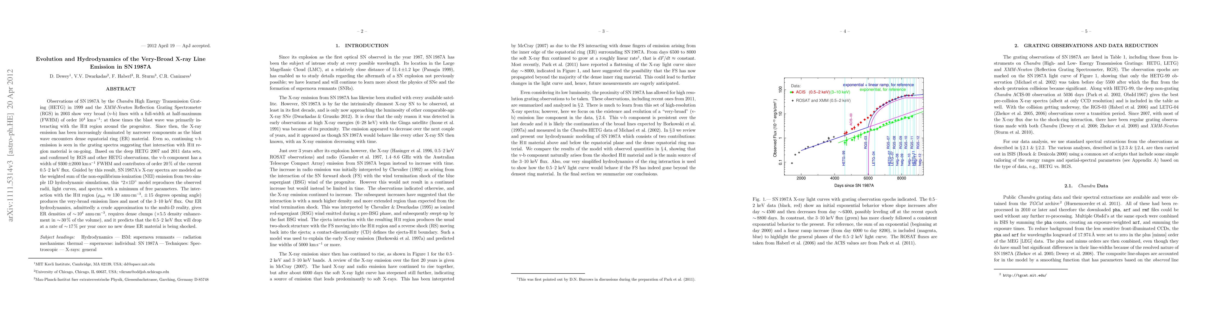 Observations of SN 1987A by the Chandra High Energy Transmission Grating (HETG) in 1999 and the XMM-Newton Reflection Grating Spectrometer (RGS) in 2003 show very broad (v-b) lines with a full-width at half-maximum (FWHM) of order 10^4 kms; at these times the blast wave was primarily interacting with the HII region around the progenitor. Since then, the X-ray emission has been increasingly dominated by narrower components as the blast wave encounters dense equatorial ring (ER) material. Even so, continuing v-b emission is seen in the grating spectra suggesting that interaction with HII region material is on-going. Based on the deep HETG 2007 and 2011 data sets, and confirmed by RGS and other HETG observations, the v-b component has a width of 9300 +/-2000 kms FWHM and contributes of order 20% of the current 0.5--2 keV flux. Guided by this result, SN 1987A's X-ray spectra are modeled as the weighted sum of the non-equilibrium-ionization (NEI) emission from two simple 1D hydrodynamic simulations, this "2x1D" model reproduces the observed radii, light curves, and spectra with a minimum of free parameters. The interaction with the HII region (rho_init \sim 130 amu/cc, +/- 15 degrees opening angle) produces the very-broad emission lines and most of the 3-10 keV flux. Our ER hydrodynamics, admittedly a crude approximation to the multi-D reality, gives ER densities of order 10^4 amu/cc, requires dense clumps (x5.5 density enhancement in \sim 30% of the volume), and it predicts that the 0.5-2 keV flux will drop at a rate of \sim 17% per year once no new dense ER material is being shocked.