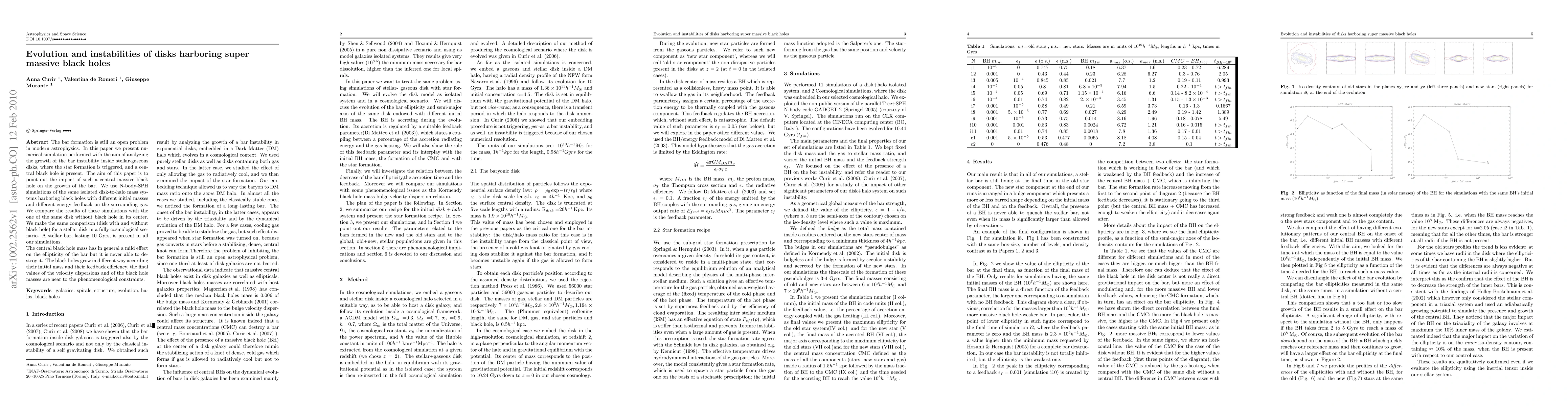 The bar formation is still an open problem in modern astrophysics. In this paper we present numerical simulation performed with the aim of analyzing the growth of the bar instability inside stellar-gaseous disks, where the star formation is triggered, and a central black hole is present. The aim of this paper is to point out the impact of such a central massive black hole on the growth of the bar. We use N-body-SPH simulations of the same isolated disk-to-halo mass systems harboring black holes with different initial masses and different energy feedback on the surrounding gas. We compare the results of these simulations with the one of the same disk without black hole in its center. We make the same comparison (disk with and without black hole) for a stellar disk in a fully cosmological scenario. A stellar bar, lasting 10 Gyrs, is present in all our simulations. The central black hole mass has in general a mild effect on the ellipticity of the bar but it is never able to destroy it. The black holes grow in different way according their initial mass and their feedback efficiency, the final values of the velocity dispersions and of the black hole masses are near to the phenomenological constraints.
