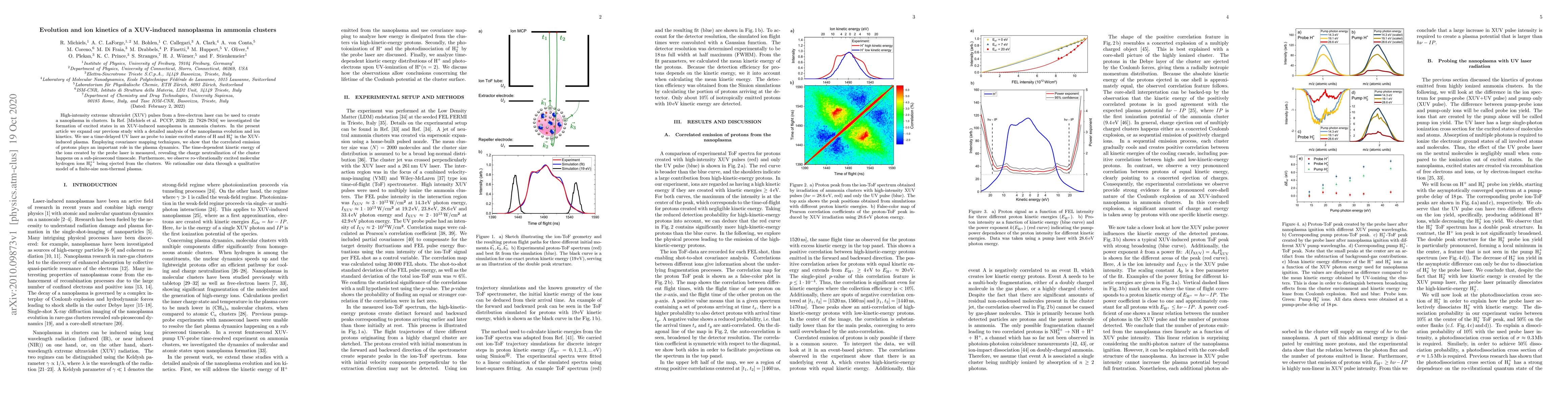 High-intensity extreme ultraviolet (XUV) pulses from a free-electron laser can be used to create a nanoplasma in clusters. In Ref. [Michiels et al. PCCP, 2020; 22: 7828-7834] we investigated the formation of excited states in an XUV-induced nanoplasma in ammonia clusters. In the present article we expand our previous study with a detailed analysis of the nanoplasma evolution and ion kinetics. We use a time-delayed UV laser as probe to ionize excited states of H and H$_2^+$ in the XUV-induced plasma. Employing covariance mapping techniques, we show that the correlated emission of protons plays an important role in the plasma dynamics. The time-dependent kinetic energy of the ions created by the probe laser is measured, revealing the charge neutralization of the cluster happens on a sub-picosecond timescale. Furthermore, we observe ro-vibrationally excited molecular hydrogen ions H$_2^{+*}$ being ejected from the clusters. We rationalize our data through a qualitative model of a finite-size non-thermal plasma.