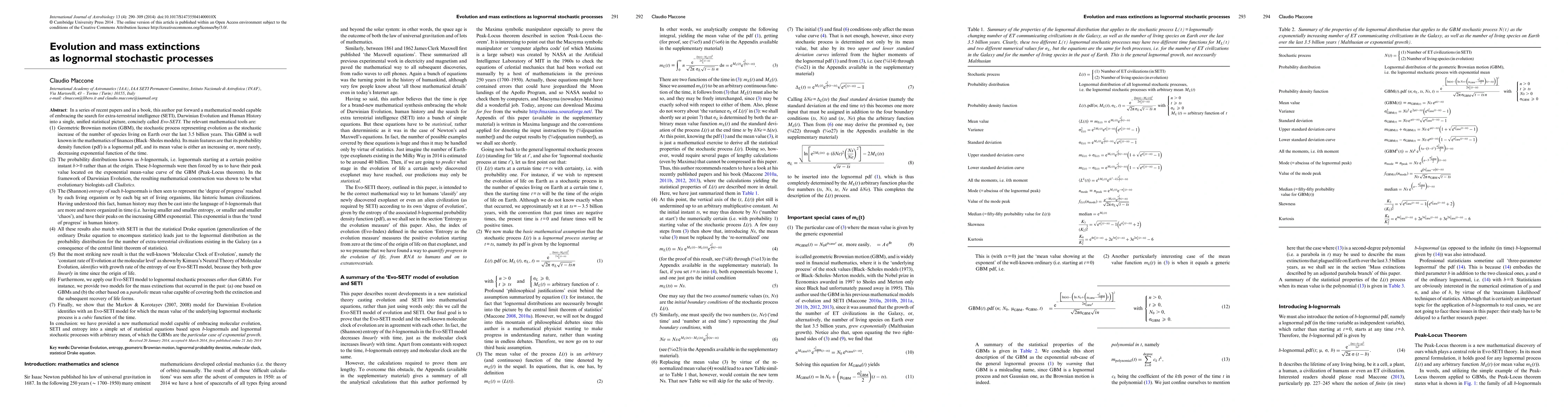 In a series of recent papers and in a book, this author put forward a mathematical model capable of embracing the search for extra-terrestrial intelligence (SETI), Darwinian Evolution and Human History into a single, unified statistical picture, concisely called Evo-SETI. The relevant mathematical tools are: (1) Geometric Brownian motion (GBM), the stochastic process representing evolution as the stochastic increase of the number of species living on Earth over the last 3.5 billion years. This GBM is well known in the mathematics of finances (Black-Sholes models). (2) The probability distributions known as b-lognormals, i.e. lognormals starting at a certain positive instant b>0 rather than at the origin. In the framework of Darwinian Evolution, the resulting mathematical construction was shown to be what evolutionary biologists call Cladistics. (3) The (Shannon) entropy of such b-lognormals is then seen to represent the 'degree of progress' reached by each living organism or by each big set of living organisms, like historic human civilizations. (4) All these results also match with SETI in that the statistical Drake equation (generalization of the ordinary Drake equation to encompass statistics) leads just to the lognormal distribution as the probability distribution for the number of extra-terrestrial civilizations existing in the Galaxy. (5) The well-known 'Molecular Clock of Evolution', namely the 'constant rate of Evolution at the molecular level' as shown by Kimura's Neutral Theory of Molecular Evolution, identifies with growth rate of the entropy of our Evo-SETI model. (6) Furthermore, we apply our Evo-SETI model to lognormal stochastic processes other than GBMs. For instance, we provide two models for the mass extinctions that occurred in the past. (7) Finally, we show that the Markov & Korotayev model for Darwinian Evolution identifies with an Evo-SETI model.