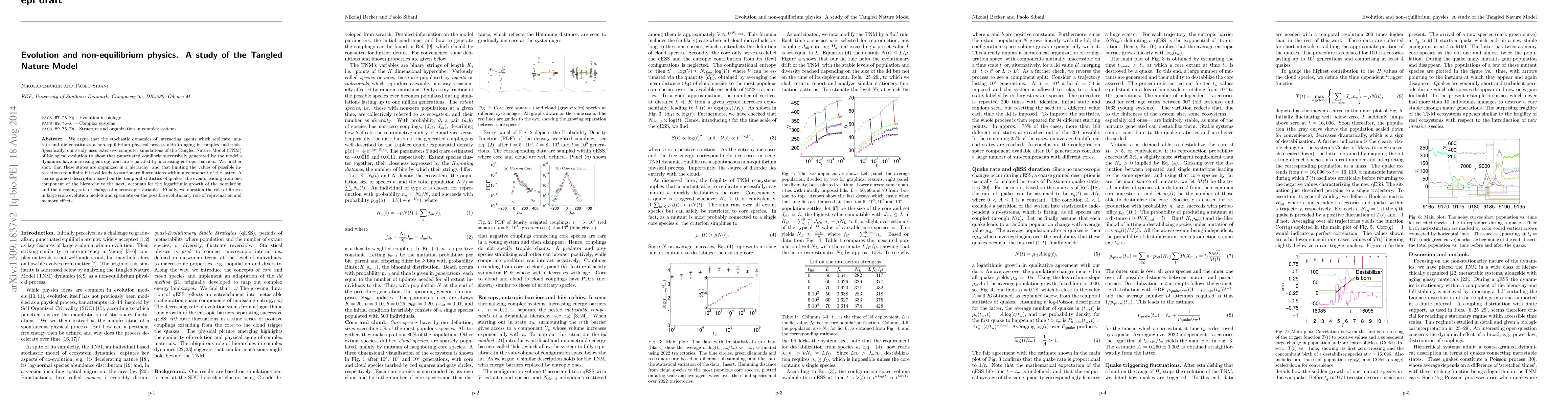We argue that the stochastic dynamics of interacting agents which replicate, mutate and die constitutes a non-equilibrium physical process akin to aging in complex materials. Specifically, our study uses extensive computer simulations of the Tangled Nature Model (TNM) of biological evolution to show that punctuated equilibria successively generated by the model's dynamics have increasing entropy and are separated by increasing entropic barriers. We further show that these states are organized in a hierarchy and that limiting the values of possible interactions to a finite interval leads to stationary fluctuations within a component of the latter. A coarse-grained description based on the temporal statistics of quakes, the events leading from one component of the hierarchy to the next, accounts for the logarithmic growth of the population and the decaying rate of change of macroscopic variables. Finally, we question the role of fitness in large scale evolution models and speculate on the possible evolutionary role of rejuvenation and memory effects.