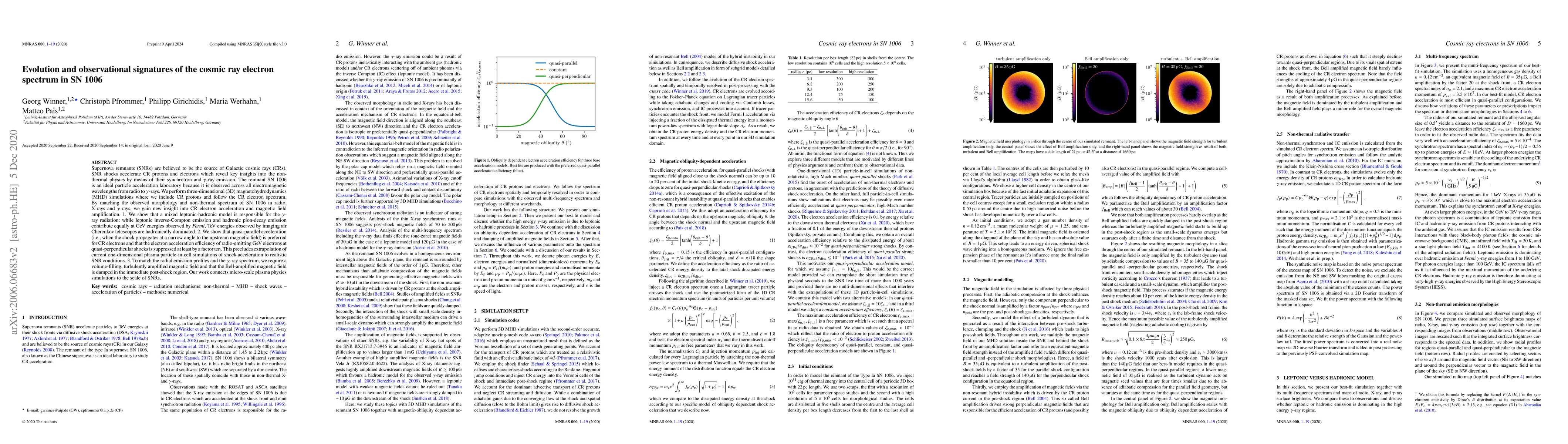 Researchers studied the cosmic ray electron spectrum in SN 1006 using 3D magnetohydrodynamics simulations, finding that quasi-parallel acceleration is preferred for CR electrons and that a mixed leptonic-hadronic model explains the observed gamma-ray radiation.