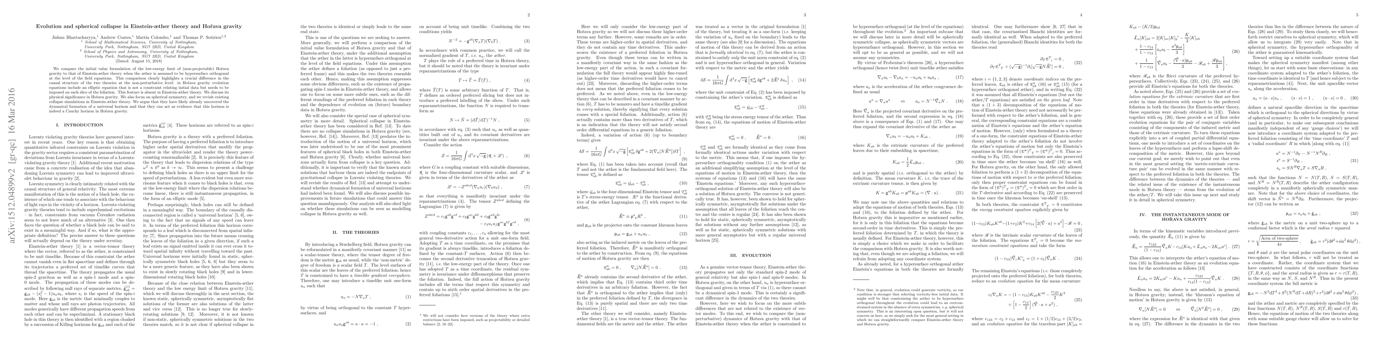 This paper compares the initial value formulations of Horava gravity and Einstein-aether theory, highlighting a crucial difference in their causal structures. It argues that Horava gravity includes an elliptic evolution equation not present in Einstein-aether theory, and discusses the potential formation of a universal horizon in spherical collapse simulations.