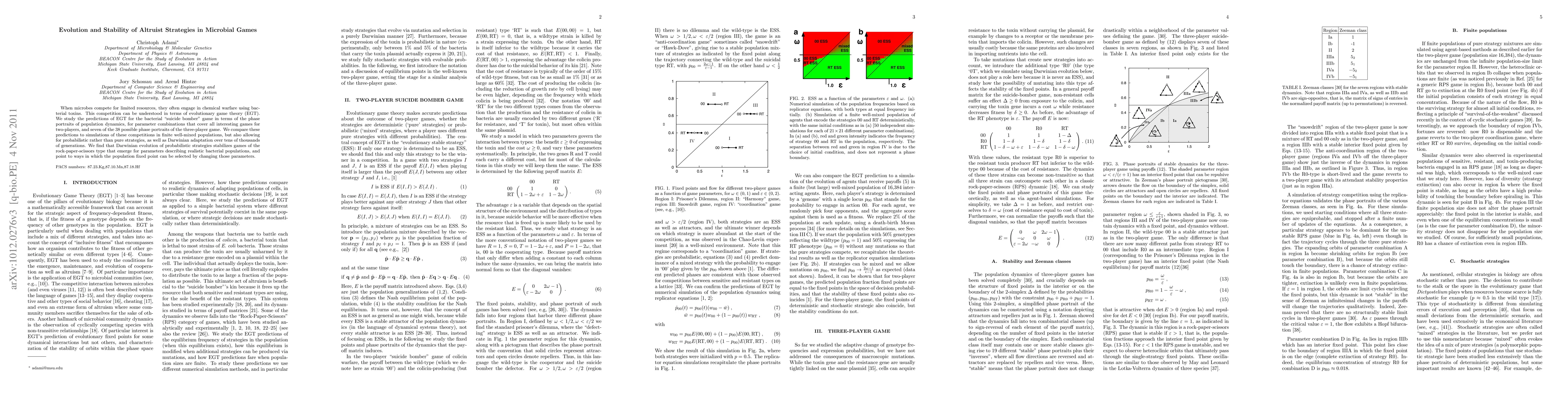 When microbes compete for limited resources, they often engage in chemical warfare using bacterial toxins. This competition can be understood in terms of evolutionary game theory (EGT). We study the predictions of EGT for the bacterial "suicide bomber" game in terms of the phase portraits of population dynamics, for parameter combinations that cover all interesting games for two-players, and seven of the 38 possible phase portraits of the three-player game. We compare these predictions to simulations of these competitions in finite well-mixed populations, but also allowing for probabilistic rather than pure strategies, as well as Darwinian adaptation over tens of thousands of generations. We find that Darwinian evolution of probabilistic strategies stabilizes games of the rock-paper-scissors type that emerge for parameters describing realistic bacterial populations, and point to ways in which the population fixed point can be selected by changing those parameters.