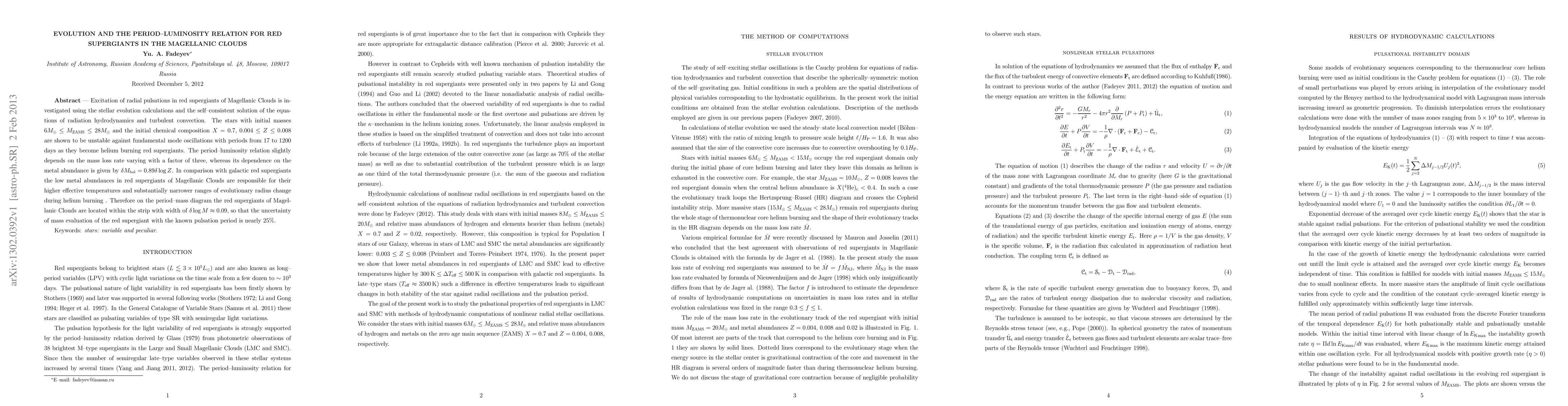This paper investigates the excitation of radial pulsations in red supergiants in the Magellanic Clouds, revealing that stars with initial masses between 6 and 28 solar masses exhibit fundamental mode oscillations. The period-luminosity relation is influenced by mass loss and metal abundance, with the latter causing higher effective temperatures and narrower evolutionary radius changes.